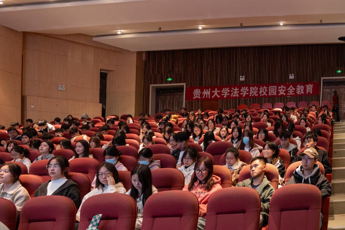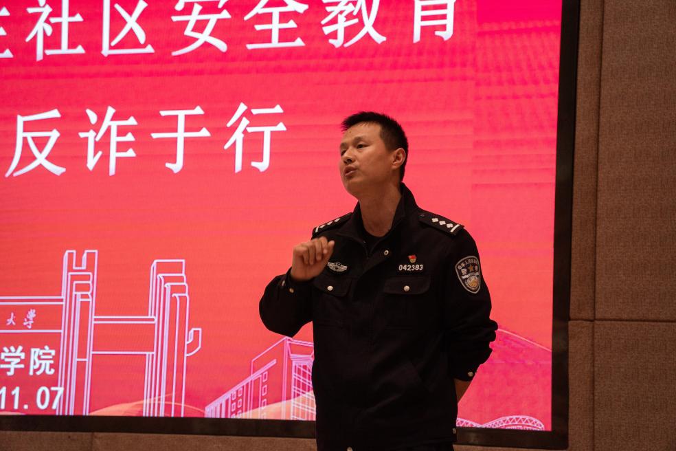 紧接着,花溪区松山派出所赵普林警官以其独特的幽默风格,为师生们带来了一场别开生面的反诈骗宣讲。赵警官不仅详细介绍了当前针对大学生群体的各类诈骗手段,还传授了识别诈骗、保护个人信息和财产安全的有效技巧。他的宣讲语言生动鲜活,案例贴近学生生活,引得现场掌声不断,有效提升了学生的防骗意识和能力。