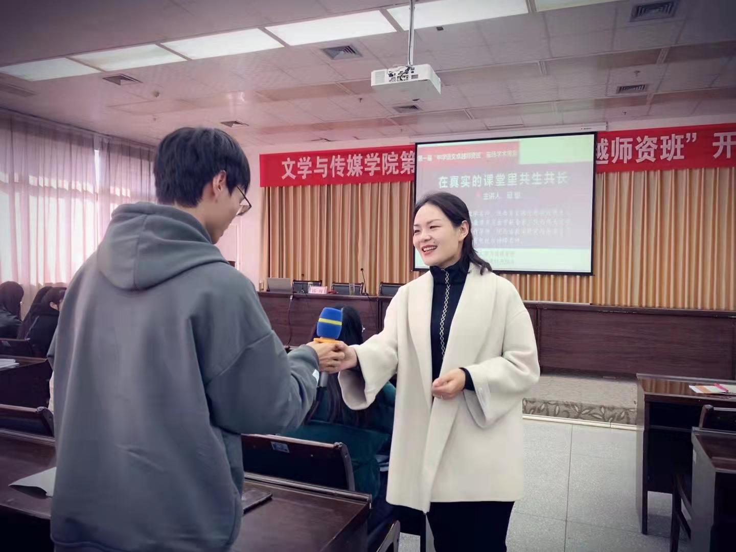11月24日下午,陕西教学名师邱俊受邀为第一届“中学语文卓越师资班”作首场学术报告,题目是《在真实的课堂里共生共长》。学术报告由“中学语文卓越师资班”班主任张格瑄主持,94名卓越师资班学生认真聆听了学术报告。