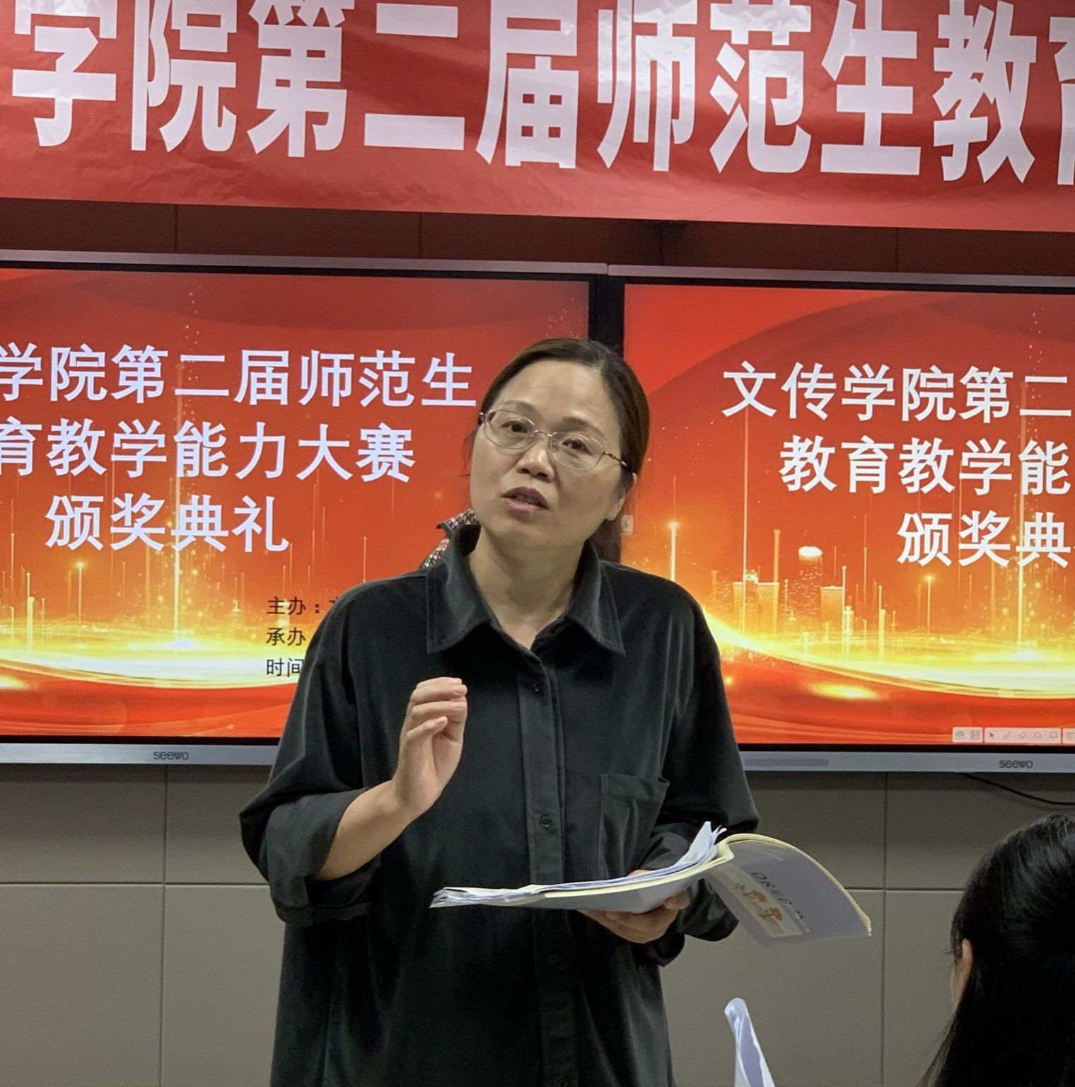 比赛环节结束后,陈岩、张美玲分别就选手表现进行精准点评。陈岩从备赛态度、课件制作、听说读写、课程育人、即席演讲、表达能力和板书设计等七个方面充分肯定了选手们的表现,同时也从粉笔字美观程度、课堂情绪感染、问题衔接过渡等三个方面指出大家的不足。张美玲以“好课如塔”为喻,结合选手们的表现点评选手表现的同时也勉励大家成为筑塔人。党总支副书记杨海蓉总结发言,号召大家磨练自己,提高专业素养,成为“四有”好老师。