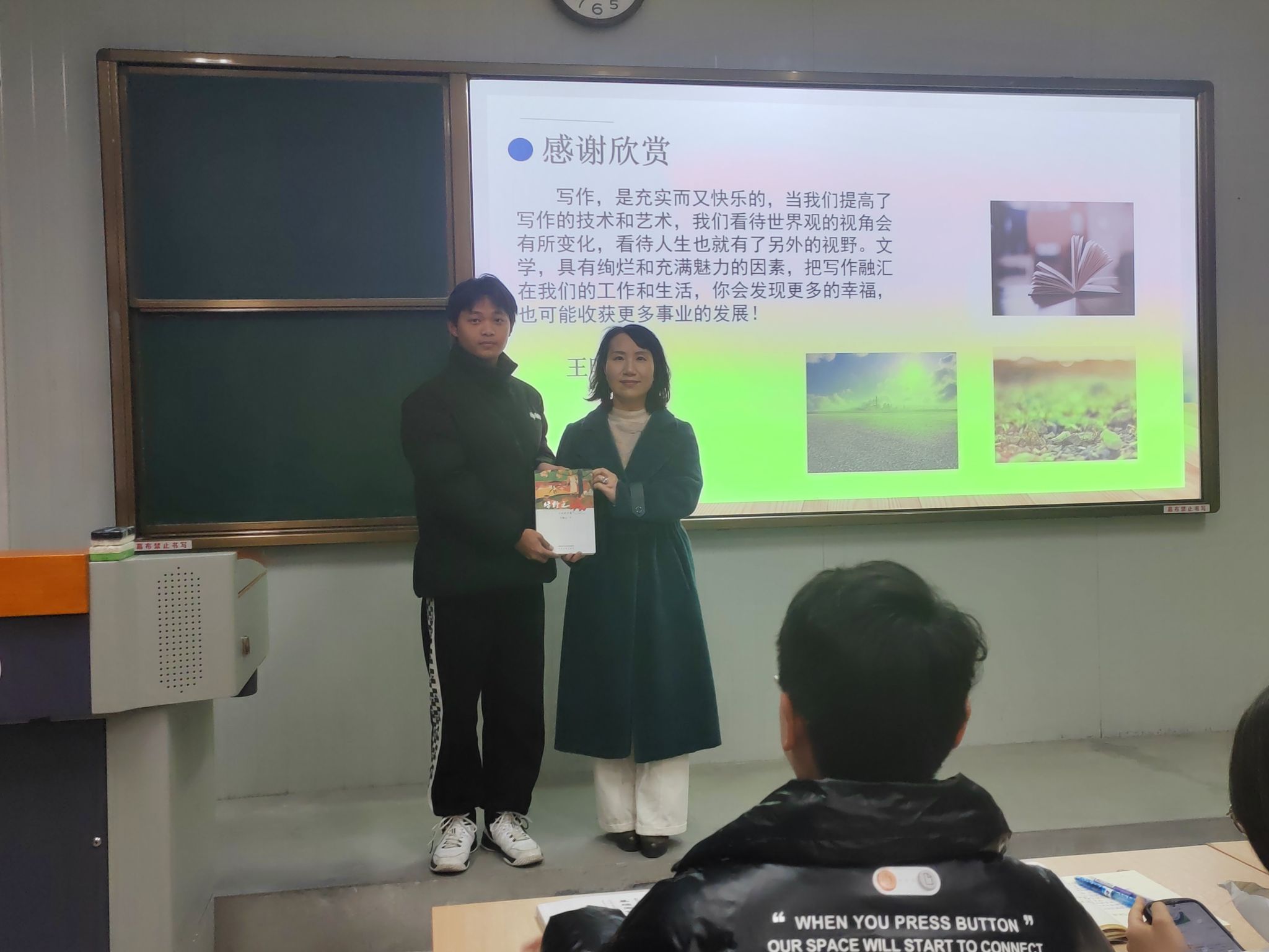 随后王晓云将自己的小说代表作品《绿野之城》赠送给同学们,最后引用博尔赫斯的“必读的书,我已饱读”激励学生们博览群书,积极创作。本次课程圆满结束,学生们反响热烈。