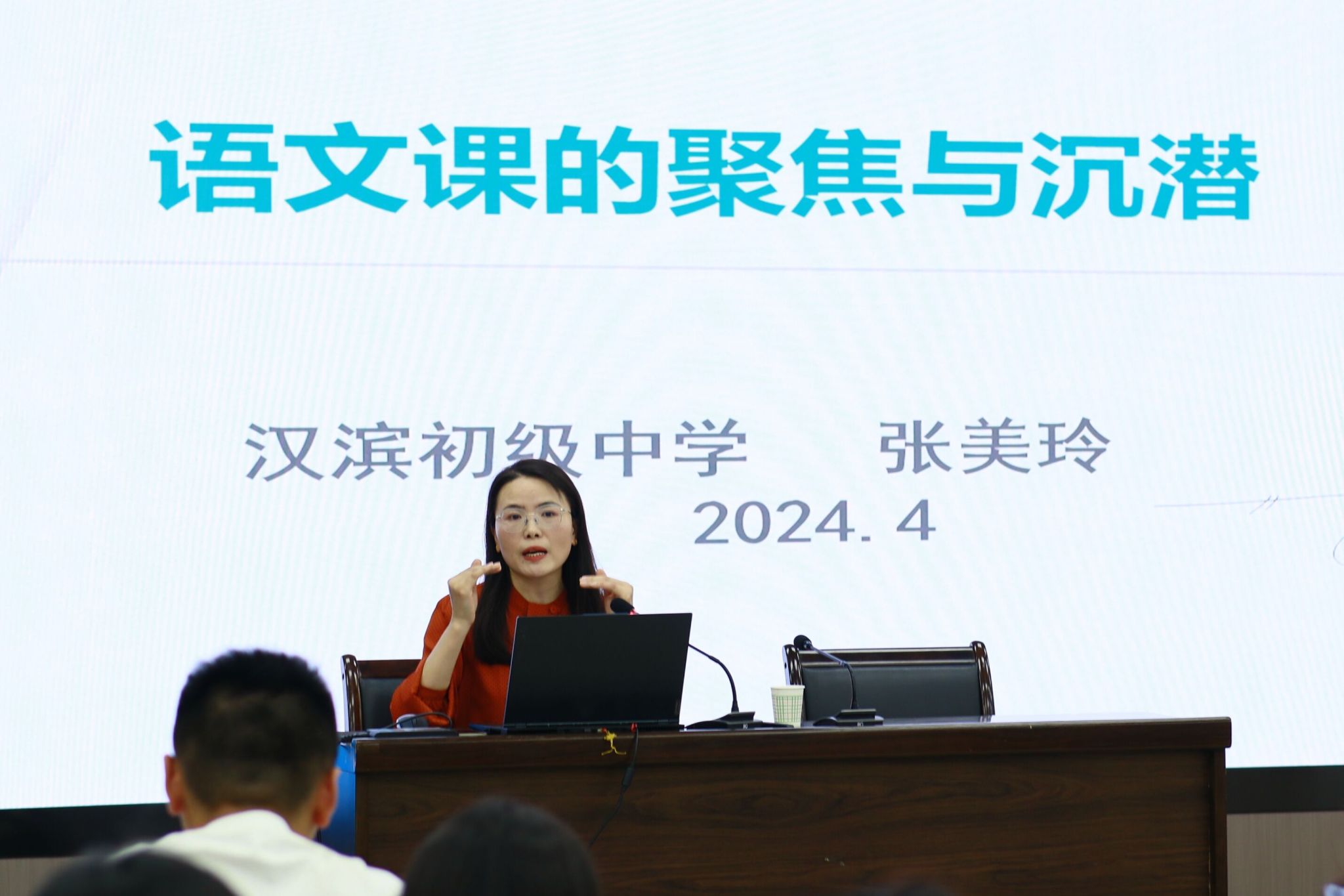 2024年4月24日下午两点半,在图书馆六楼报告厅,pp电子游戏平台网站邀请到汉滨初级中学陕西省教学能手张美玲老师为第三届“中学语文卓越师资班”带来题为《语文课聚焦与沉潜》的精彩讲座。班主任唐明珍和“中学语文卓越师资班”全体学生聆听了本场讲座。
