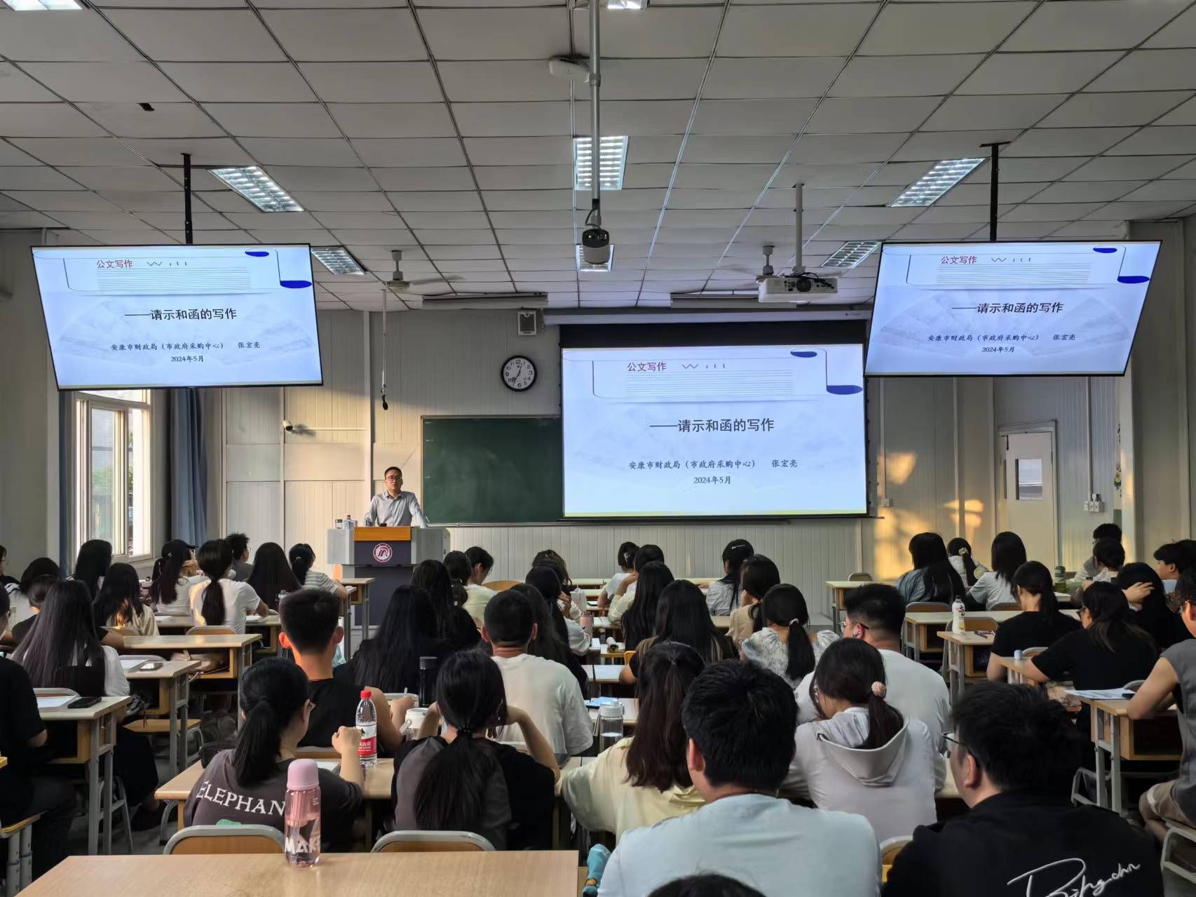 按照应用文写作“双师课程”教学计划,pp电子游戏平台网站分别于5月21日、28日和6月4日、11日、14日邀请课程安康市政府采购中心张宏亮为汉语言文学2023级1、2班学生讲授请示、批复、报告、函、纪要等公文和申论写作的技巧。校内任课教师胡少山随堂参与了授课。