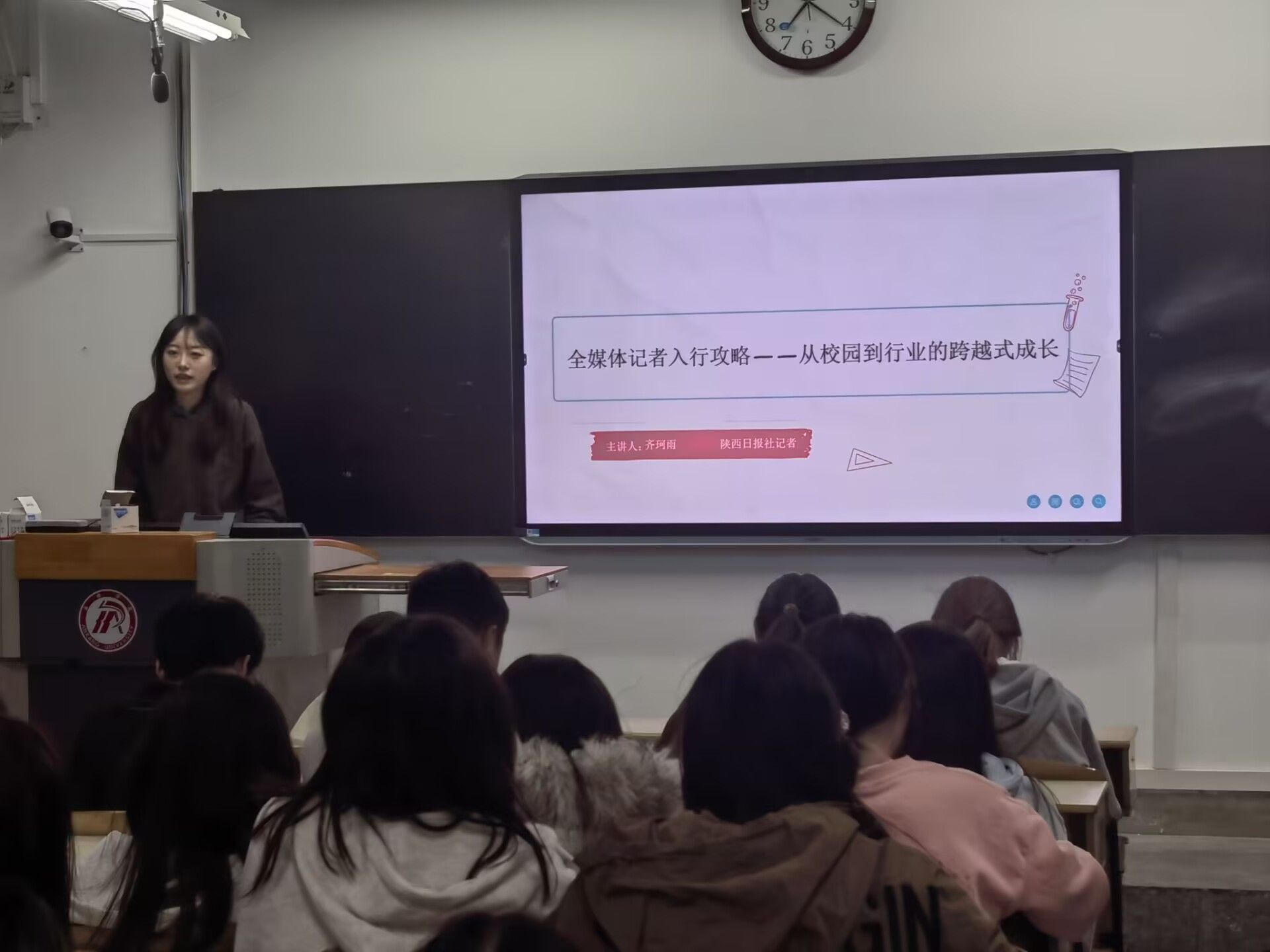 讲座中,齐珂雨记者首先向同学们揭示了当下媒体行业从传统媒体向全媒体转型的态势随后,她分享了全媒体记者的生存法则”,详细阐述了全媒体记者所需的能力素养。她强调,全媒体记者需具备内容生产、技术应用、数据分析、沟通协作等多方面能力。在内容生产上,要培养有效的沟通技巧,通过倾听、提问、反馈获取真实丰富的信息;还要阅读经典著作和优秀新闻作品,锤炼逻辑思维。技术应用方面,要掌握摄影摄像基础知识、熟练运用视频剪辑软件,了解H5等交互产品制作流程,为新闻报道增添多元形式与内容。同时,记者应具备跨媒体思维和能力,实现新闻内容在多平台的高效传播与价值最大化。