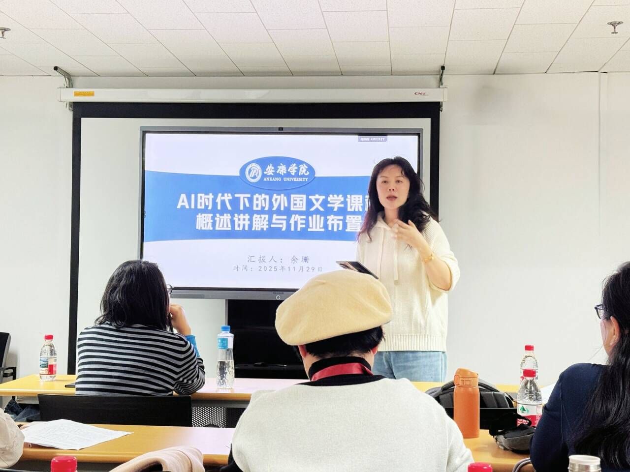 在“国内外学界外国文学教学与研究的热点与趋势”分论坛上,余珊老师以《AI时代外国文学课程教学创新与实践》为题作专题报告。她结合自身教学实践,系统阐述了人工智能技术在外国文学课程中的应用策略,以及课程设计与作业布置的创新方法与分论坛相关学者讨论交流。