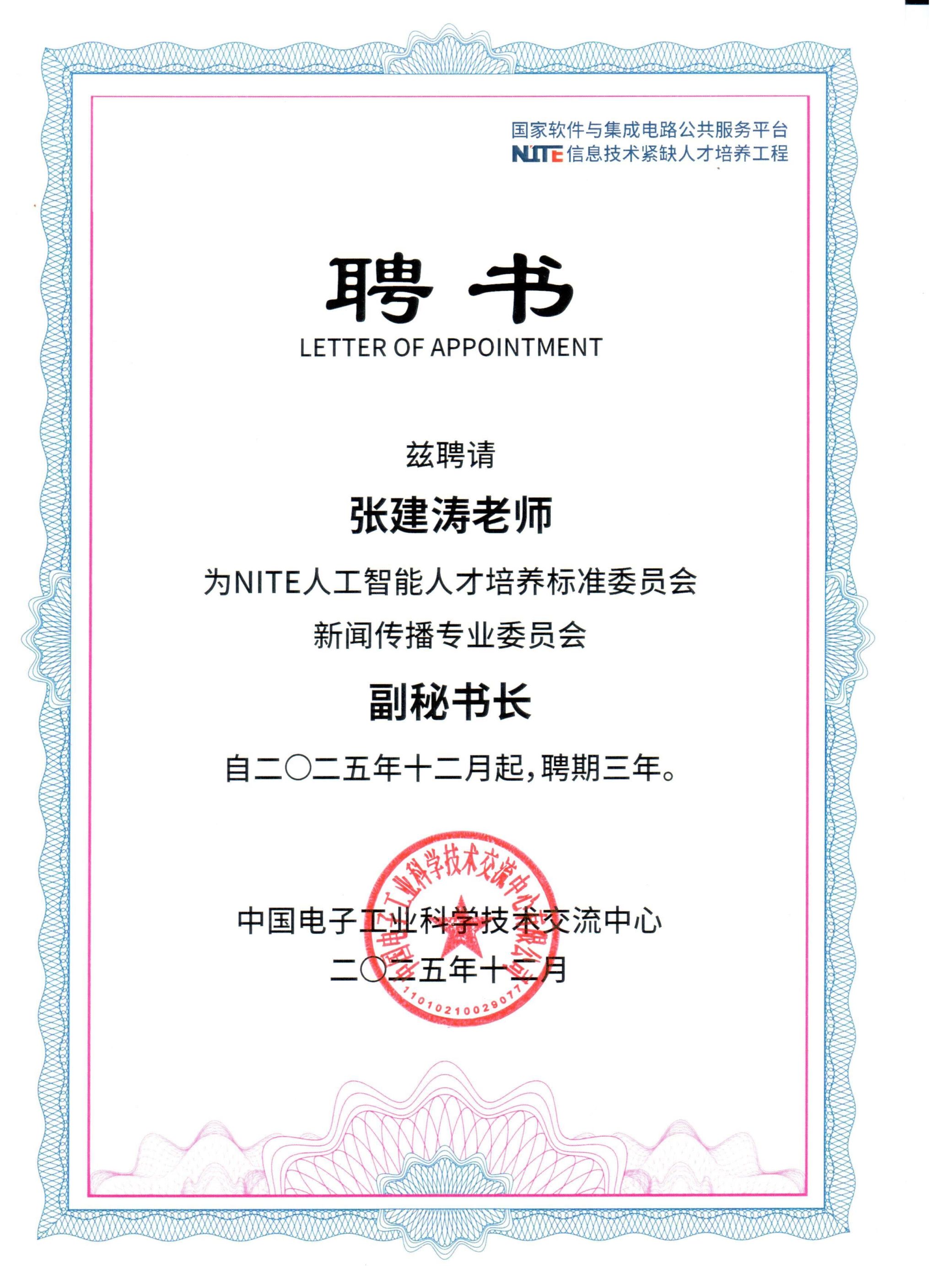 会议期间,举行了NITE人工智能人才培养标准委员会成立仪式,张建涛被聘为“NITE人工智能人才培养标准委员会新闻传播专业委员会副秘书长”。
