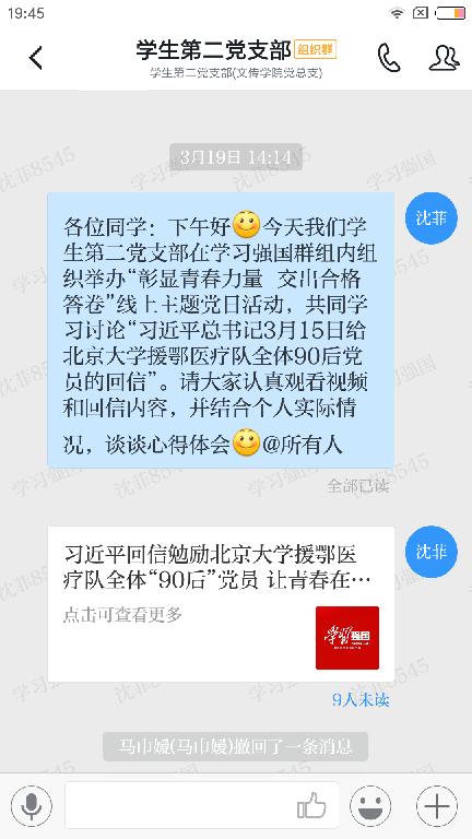 2020年3月19日下午14:30,pp电子游戏平台网站学生第二党支部通过“学习强国”平台,组织全体党员集中学习了习近平总书记的回信内容。全体党员倍感振奋和鼓舞,并结合自身实际情况进行了热烈讨论。