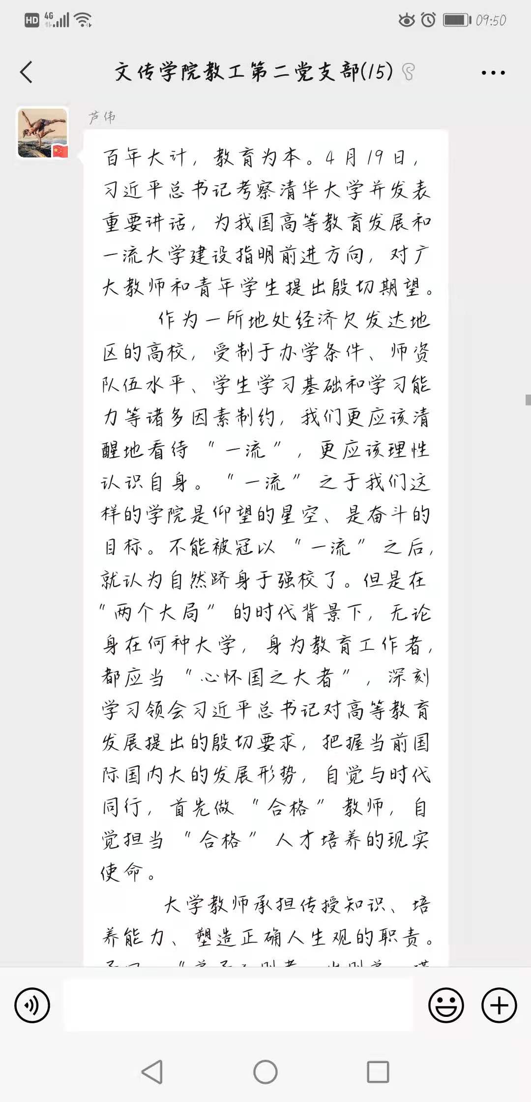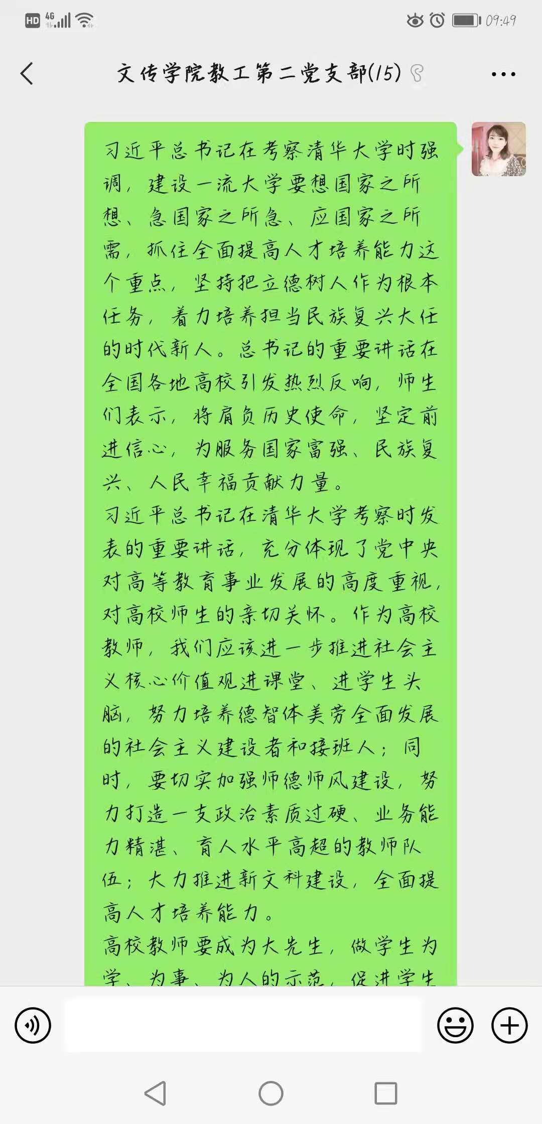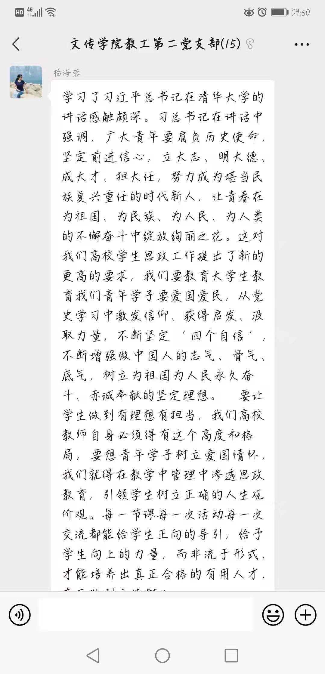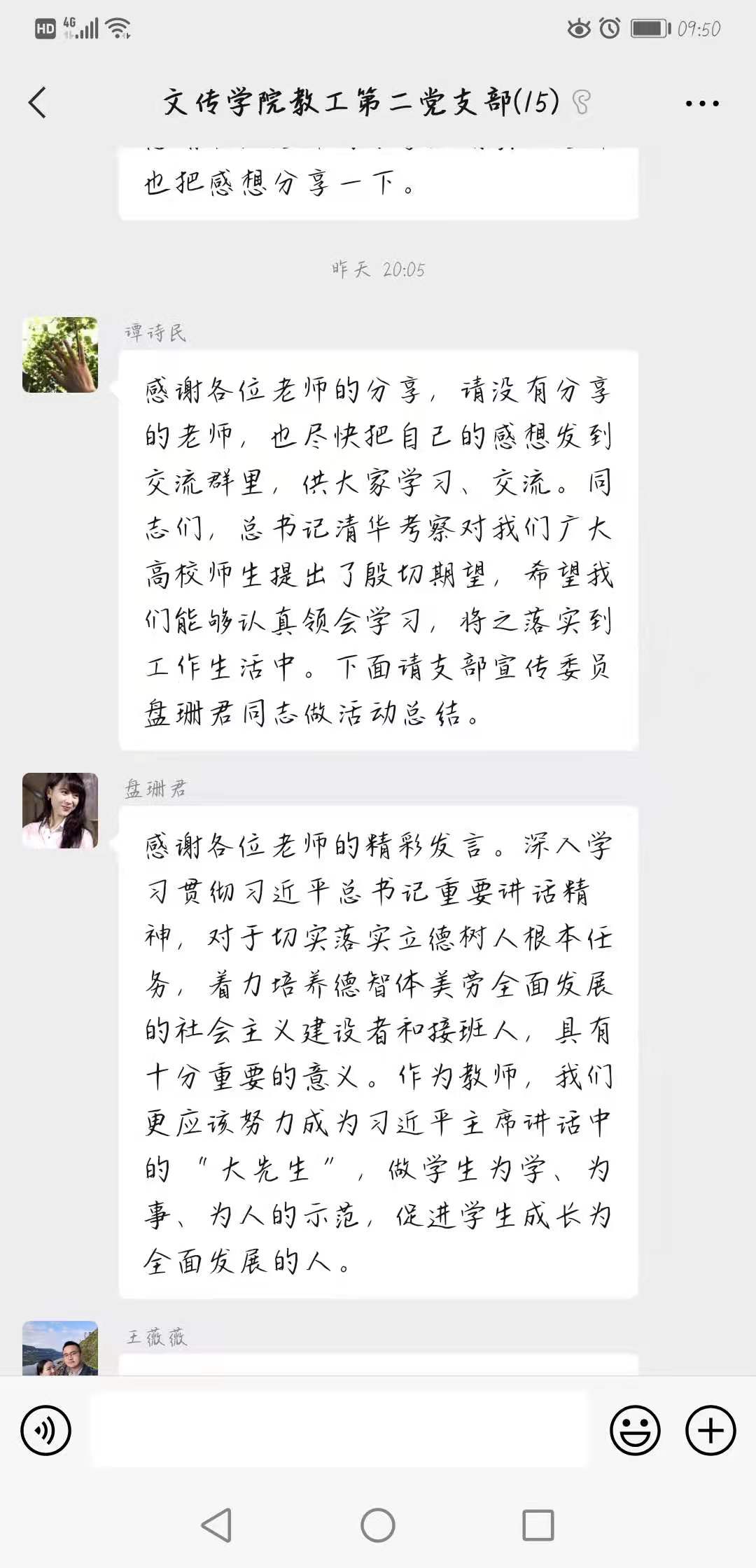 4月29日,pp电子游戏平台网站教工二支部依托支部微信平台开展了“深入学习习近平总书记清华考察重要讲话,牢固树立高校‘立德树人’根本任务”主题党日活动。活动由教工二支部书记谭诗民主持,支部全体党员共同学习并参与讨论。