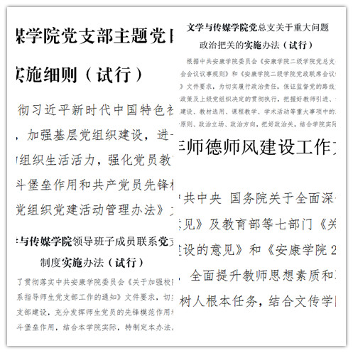 学院先后出台《pp电子游戏平台网站党建工作制度汇编》《pp电子游戏平台网站党风廉政建设责任制实施办法(试行)》《pp电子游戏平台网站党支部主题党日活动实施细则(试行)》《pp电子游戏平台网站党总支关于重大问题政治把关的实施办法(试行)》《pp电子游戏平台网站领导班子成员联系党支部制度实施办法(试行)》《pp电子游戏平台网站师生交流日制度》《pp电子游戏平台网站2022年师德师风建设工作方案》《2021年pp电子游戏平台网站学生学业导师实施细则(修订)》《pp电子游戏平台网站行业导师聘任管理办法》《pp电子游戏平台网站“中学语文卓越师资班”人才培养计划行动方案(试行)》《pp电子游戏平台网站领导干部听评课实施细则(试行)》等制度、方案,进一步加强和规范学院党建工作、教学科研工作、师德师风建设等多项工作。