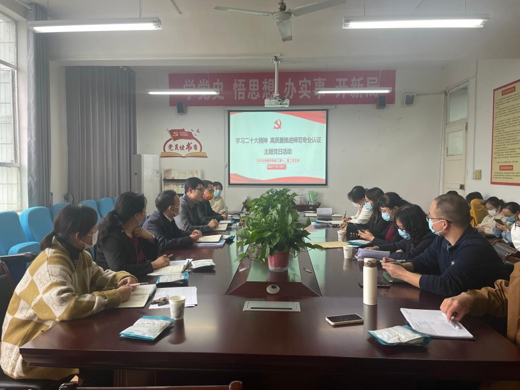 10月16日—22日,中国共产党第二十次全国代表大会在北京人民大会堂隆重召开,会议内涵丰富、主题鲜明、思想深邃、催人奋进。为深入学习领会党的二十大精神,10月26日下午,pp电子游戏平台网站教工第一、第二党支部在2307会议室联合开展了“学习二十大精神,高质量推进师范专业认证”主题党日活动,由教工第一党支部书记韩文霞主持,教工第一、第二党支部全体党员参加学习。
