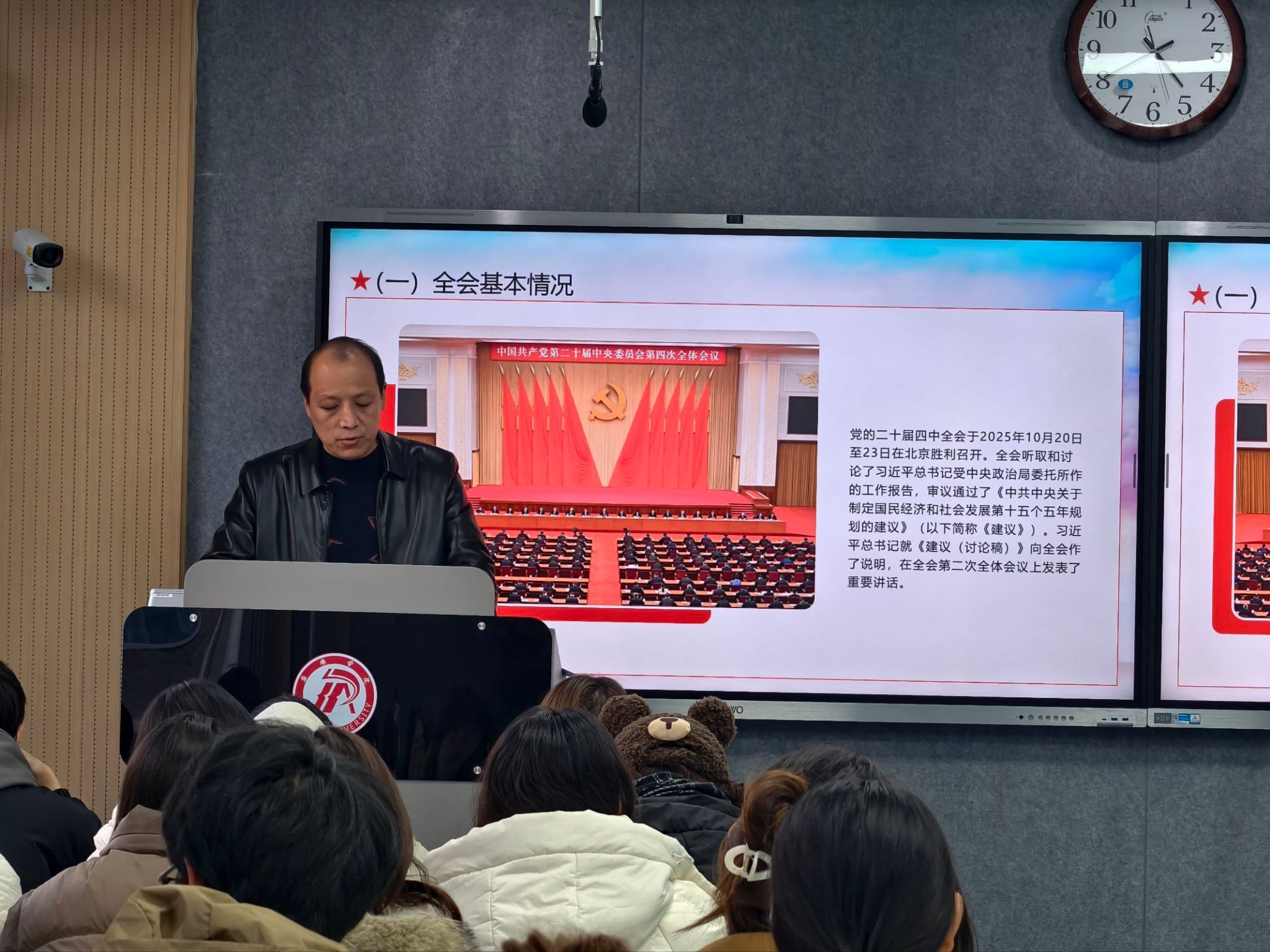 为深入学习贯彻党的二十届四中全会精神,进一步提升学生党员的理论素养与政治自觉,pp电子游戏平台网站学生党支部于12月17日举办专题党课,本次党课以“深学笃行全会精神,实干担当时代重任”为主题,由学院党总支书记任森龙主讲。