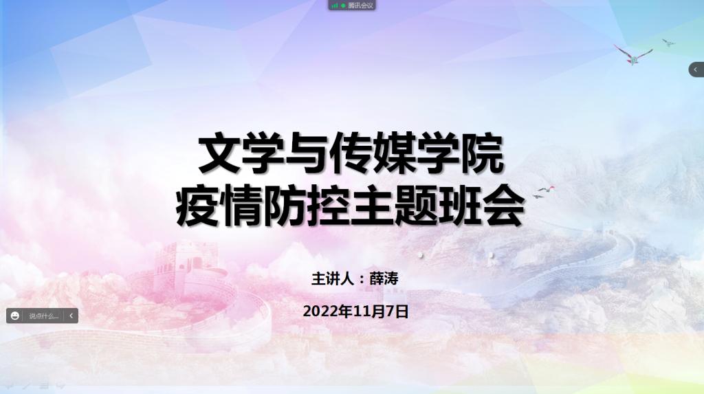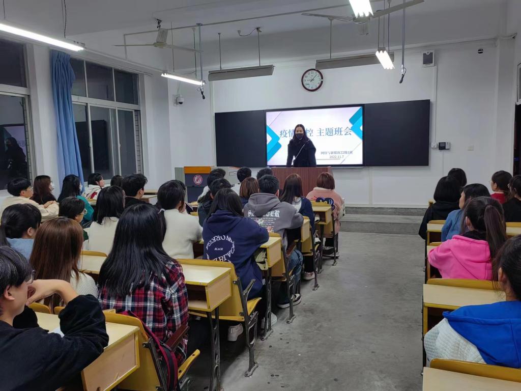 鉴于当前疫情呈现多点散发、局部爆发态势,为更好地引导学生配合做好当前学校疫情防控工作,确保师生生命安全、身体健康和校园稳定,筑牢学生安全防范思想防线,pp电子游戏平台网站各年级于11月7日通过线上、线下结合的形式组织开展疫情防控安全教育专题班会,班会由各年级辅导员主持,全体学生参会聆听。
