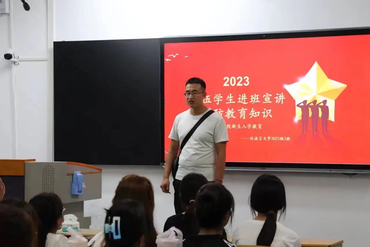 为引导广大青少年赓续红色血脉,树立国防意识,进一步贯彻落实习近平总书记关于加强全民国防教育的重要指示精神,9月12日下午,pp电子游戏平台网站在一号教学楼举办国防教育知识宣讲暨新生入学教育讲座,并邀请退伍学生艾佳新、桑雪、严庆、刘寒龙、张振豫进入各班讲授,2023级全体新生参加此次活动。