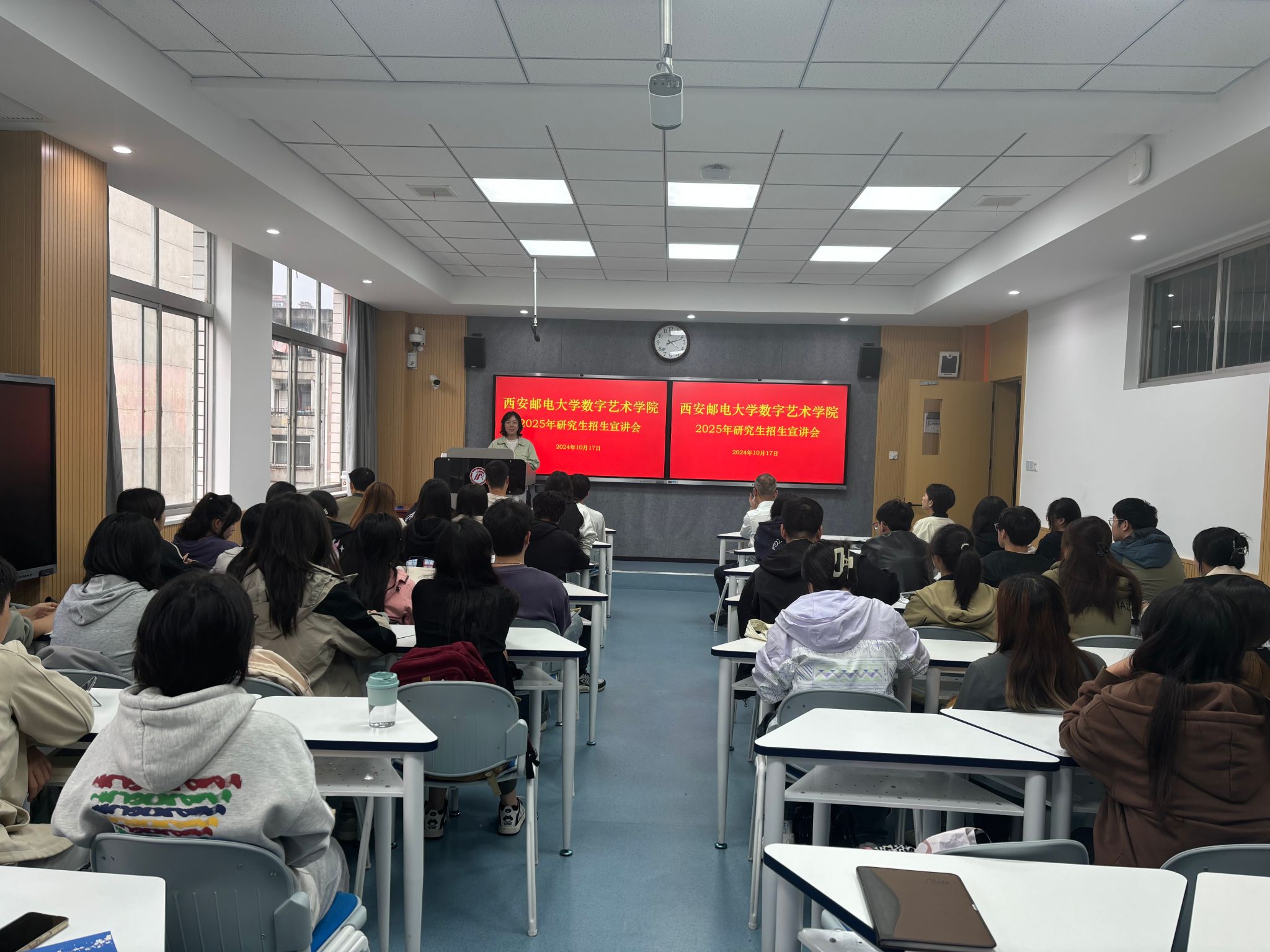 2024年10月17日下午,西安邮电大学数字与艺术学院副院长闫兴亚及数字媒体系主任常嘉玲莅临pp电子游戏平台官网,开展2025届研究生招生宣传活动。pp电子游戏平台网站党政办主任、网络与新媒体系教师崔瑜,就业办公室主任薛涛及网络与新媒体2024、2025、2026届有考研意向的学生参加了此次宣讲会,会议由崔瑜老师主持。