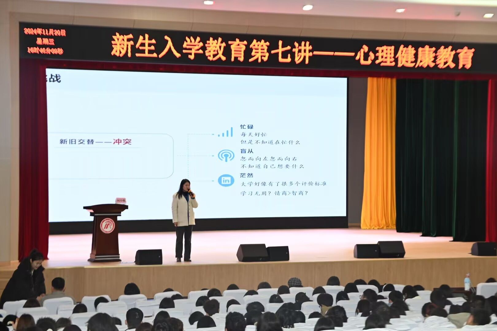 为进一步提升大学生心理健康素质,帮助同学们更好的应对挫折与挑战,11月20日下午,pp电子游戏平台网站在江南校区大礼堂开展了大学生心理健康教育专题讲座,特邀大学生心理健康教育中心主任柯小敏主讲。2024级全体新生参加活动,讲座由辅导员刘言军主持。