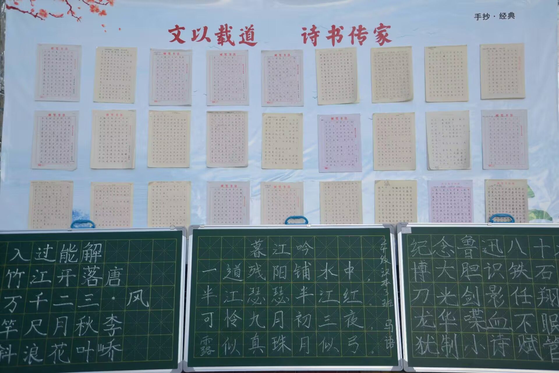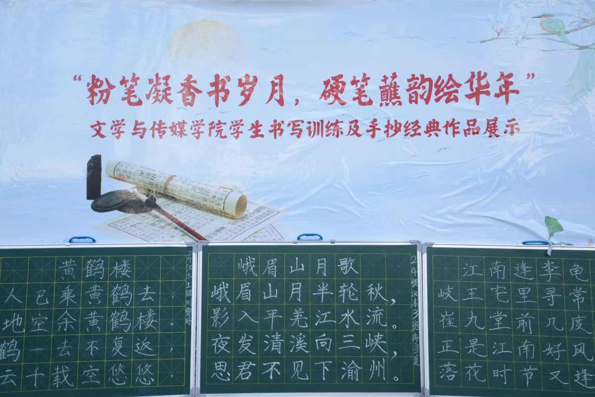 校园林荫道旁,粉笔字展示区的七言诗抄写精彩纷呈,有的字体刚劲有力,如颜筋柳骨般气势恢宏,将七言诗的磅礴意境表现得淋漓尽致;有的则灵动飘逸,仿佛每一个笔画都随着诗句的韵律在黑板上翩翩起舞。无论是李白的豪放洒脱,还是杜甫的沉郁顿挫,都在学生们的粉笔字中得以生动呈现,引得过往师生纷纷驻足欣赏。