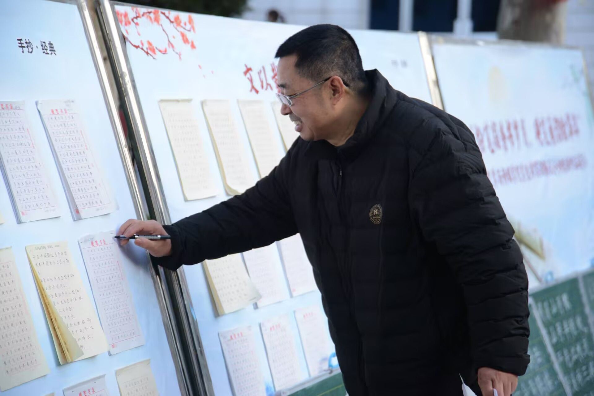 在手抄经典作品展示区,同学们以硬笔为毫,书写《论语》这一传统文化典籍中的精彩篇章,在纸张上细腻勾勒孔子及其弟子的智慧箴言。从“学而不思则罔,思而不学则殆”的学习之道,到“己所不欲,勿施于人”的处世之理,一笔一划间尽显对圣贤的尊崇与敬畏。工整的字迹、严谨的排版,令观赏师生赏心悦目。本次粉笔字和手抄经典展示分项设奖,由周海霞、邹棠华老师担任评审,共有55名同学的作品脱颖而出,荣获优秀奖。