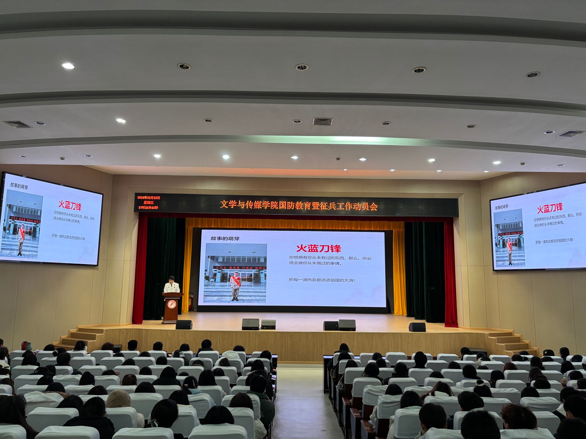 为帮助学生全面了解征兵政策,激发学生应征入伍热情,增强国防意识,12月18日下午,pp电子游戏平台网站在江南校区大礼堂开展了国防教育暨征兵工作动员会,邀请pp电子游戏平台官网退役大学生汉语言文学2023级1班郭晶晶、汉语言文学2023级5班俎佳磊分享军旅生涯和心路历程。辅导员刘言军、喻言及2024级全体新生参会。