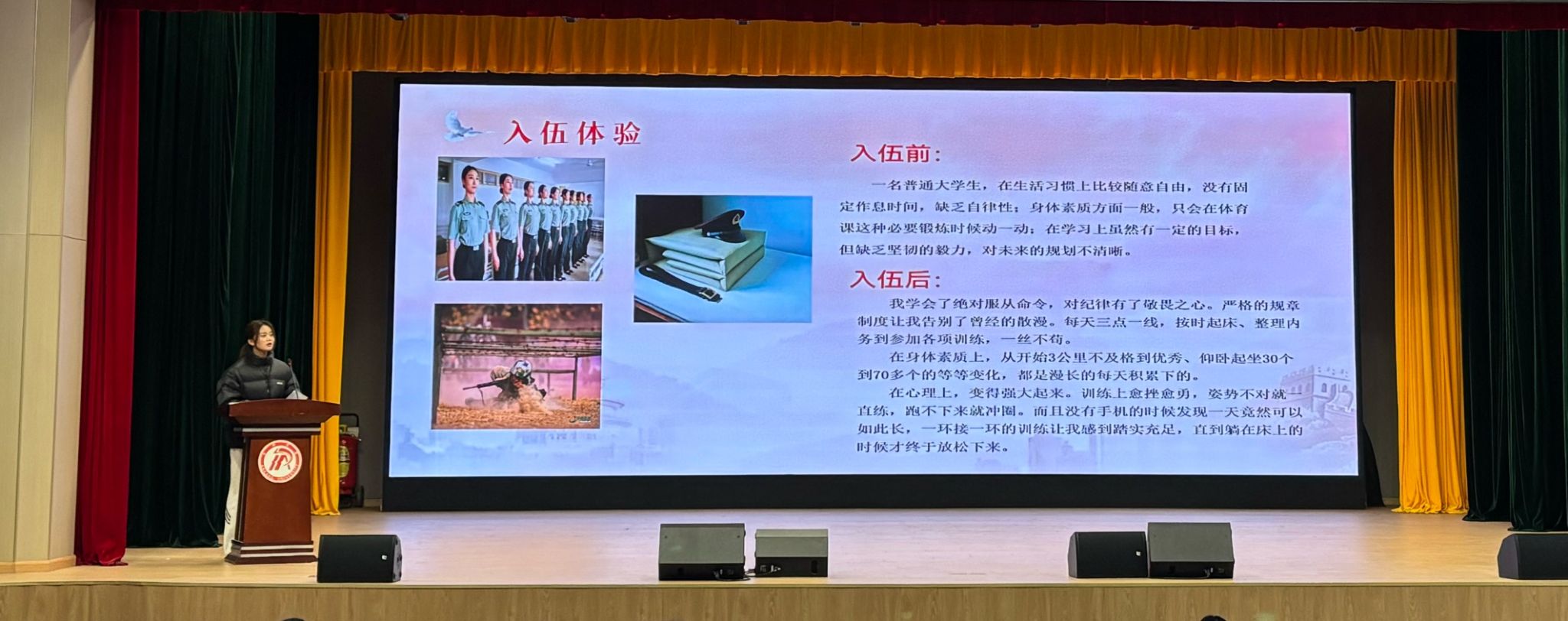 郭晶晶围绕入伍动机、入伍流程、入伍体验和未来成长等方面展开分享,大学入学后,她深感青年一代的责任与担当,怀着崇敬与向往,毅然决然地投身国防事业,她感慨严格的军事训练锤炼了体魄,磨炼了意志,军旅生涯将激励她在未来道路上奋勇前行。俎佳磊通过分享从初入军营的青涩到成长为一名合格士兵的历程,讲述了自己在军旅生活中的成长与收获,从害怕困难到战胜恐惧、超越自我的蜕变,永不服输的意志。最后,两位同学呼吁大家积极响应国家号召,踊跃参军入伍,用青春和热血书写壮丽的人生篇章,为建设强大稳固国防贡献青春力量。