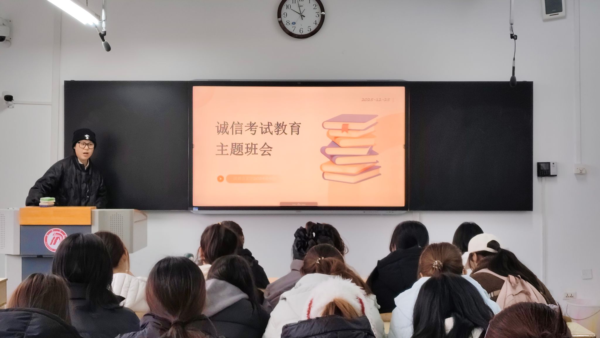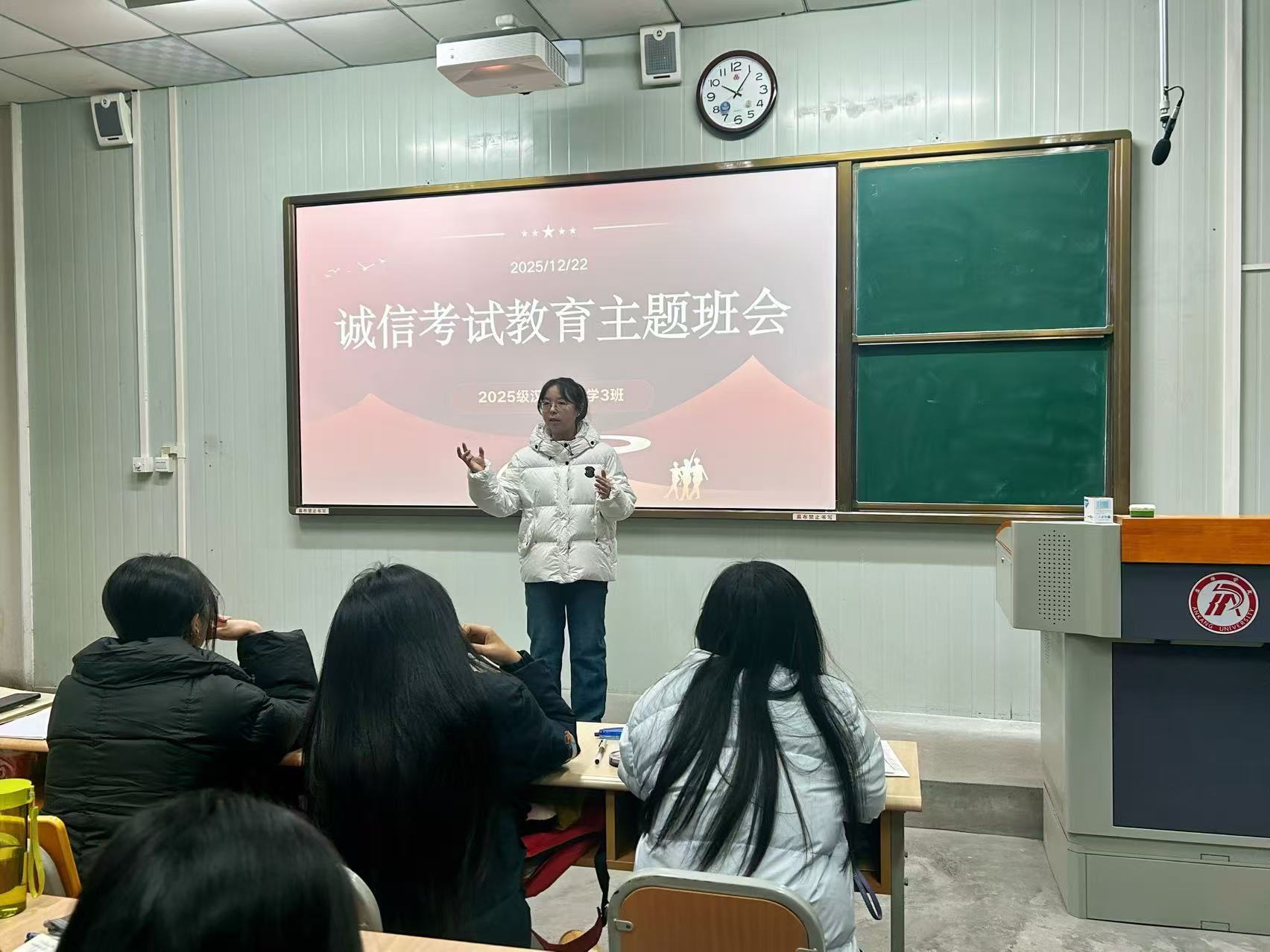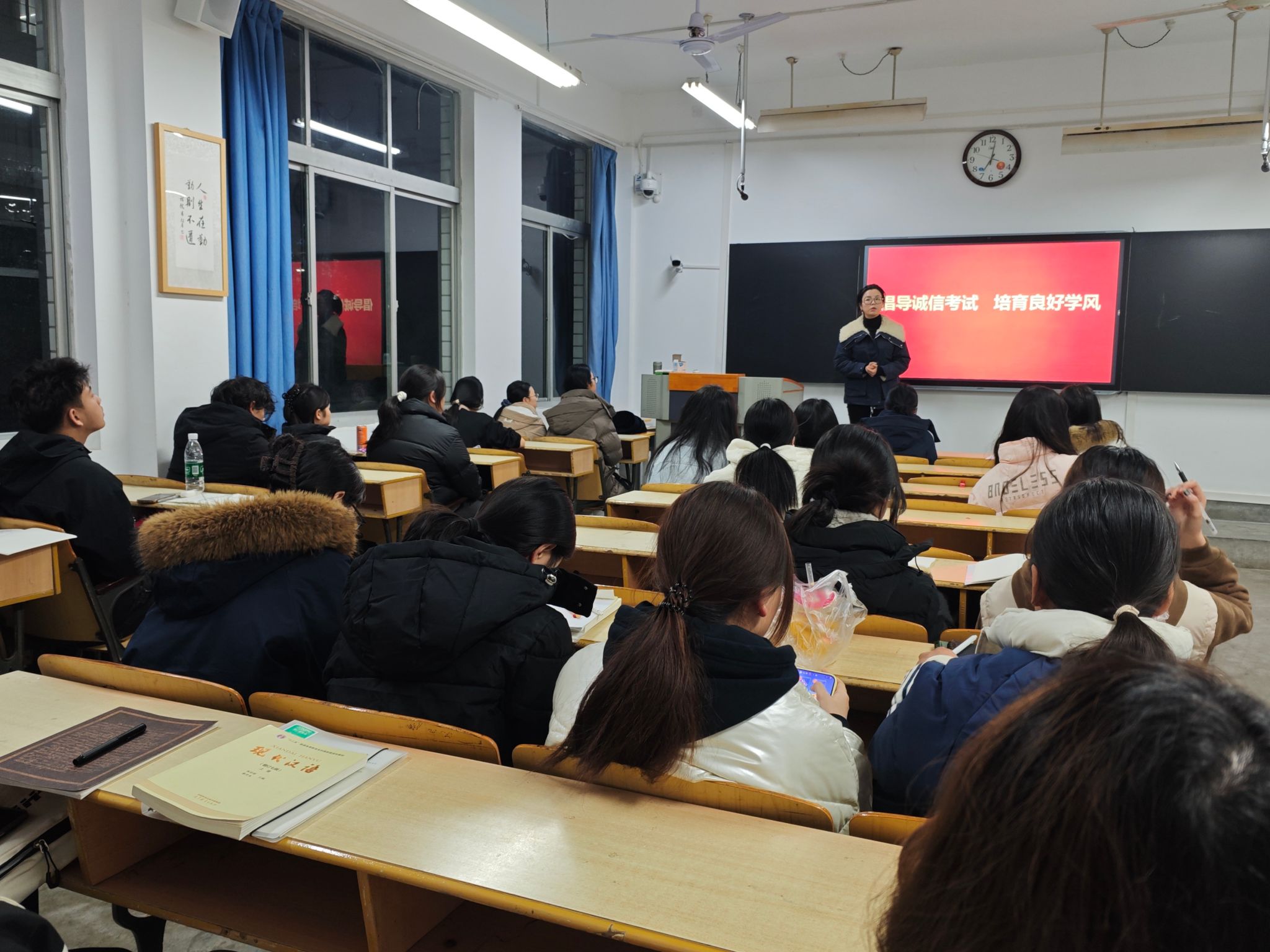 班会上,辅导员和班主任带领同学们集中学习了《pp电子游戏平台网站学生手册》《pp电子游戏平台网站学士学位授予条例(修订)》等相关管理规定,重点解读了考试违纪行为的认定标准及相应处理办法,强调诚信应考是学生基本行为规范,也是立身立学的重要准则。通过典型案例分析,引导学生深刻认识考试作弊的危害,牢固树立“诚信为本、守纪为荣”的意识。
