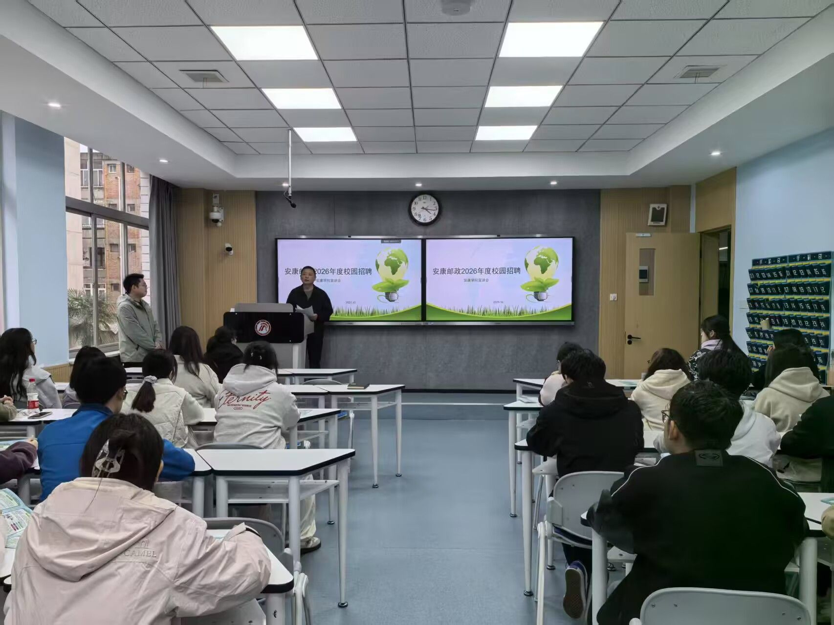 喻玺系统全面地介绍了邮政安康公司的整体情况、本次招聘的具体岗位、富有竞争力的薪酬福利体系以及清晰的职业发展前景,并通过播放企业宣传片,生动直观地展示了企业的文化风貌与核心业务场景,使同学们对邮政系统的实际运作模式有了深刻理解。在随后的交流环节中,喻玺针对同学们高度关注的招聘流程、县域岗位的具体分布及工作职责等焦点问题,进行了耐心细致地解答。