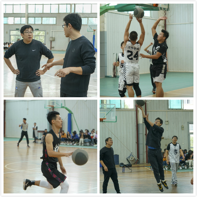 接下来,激动人心的新老生篮球友谊赛正式开始。在学生们加油呐喊中,新生球队激情四射,老生球队配合娴熟,比赛过程高潮迭起。中场休息时,还举办了男子三分球投篮趣味比赛和女子两分球投篮趣味比赛,场上场下互动热烈。比赛下半场,学院院长杨运庚、党总支书记芦伟、副院长朱云、曹刚博士也分别加入新生球队和老生球队,参与到比赛中,为篮球友谊赛增添了趣味。