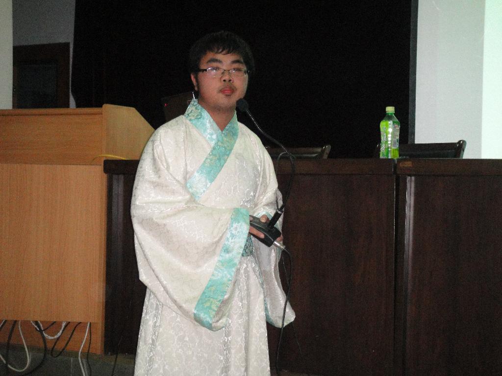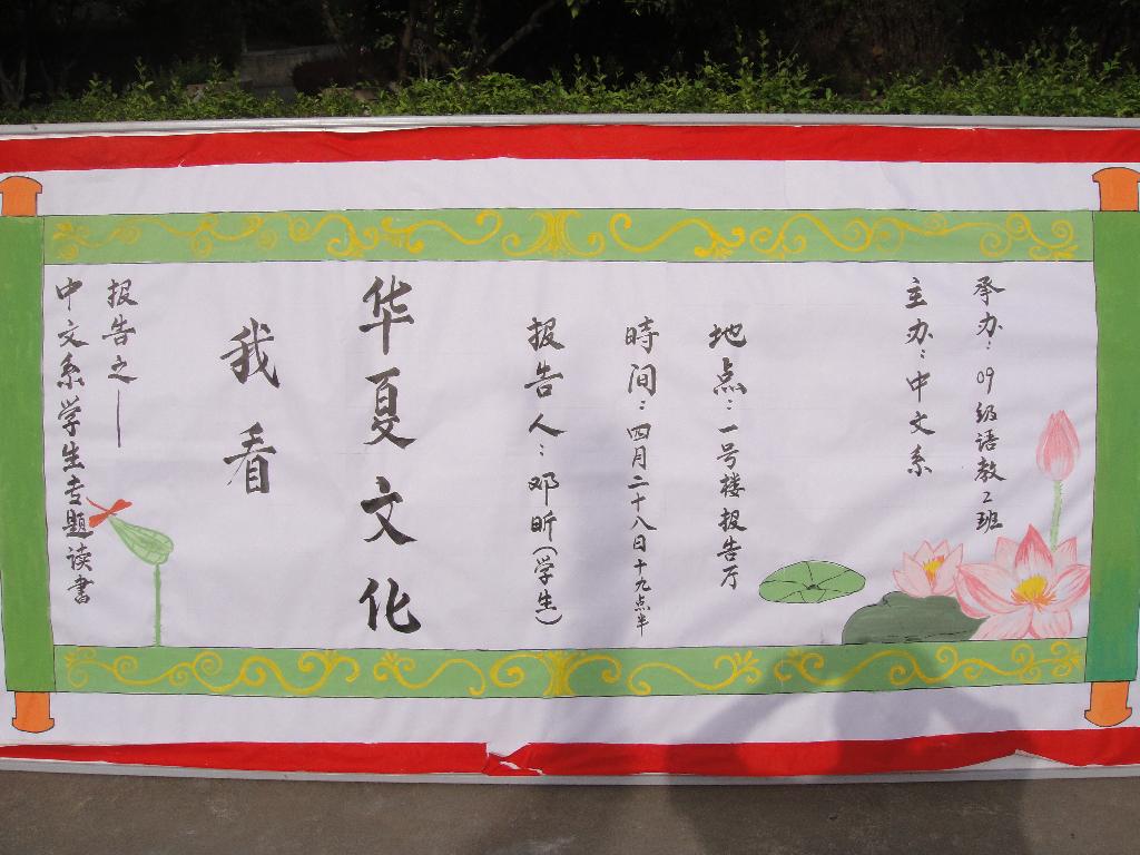 2010年4月28日晚,在中文系电影文学社的组织下,09级语文教育2班学生邓昕在一号教学楼六楼报告厅做了一场题为’我看华夏文化“的读书报告。在报告中邓昕同学以他幽默的语言给同学们做了一场精彩的报告。邓昕同学首先从历史的演变概括了华夏文化的发展脉络,接着重点从华夏文化中的礼仪和服饰方面谈了自己对华夏礼仪文化和服饰文化的独特见解。在讲解古代礼仪时,邓昕同学身穿汉服,当场示范各种古代礼仪,博得同学们的阵阵喝彩。