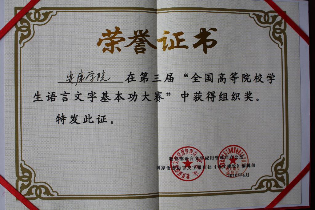 导航痕迹 首页 > 新闻通知 > 学院新闻 > 正文 学院新闻 通知公告 中文系在“第三届全国高等院校学生语言文字基本功大赛”中再获佳绩 发布人: 发布日期:2010年05月10日 阅读次数: 中文系汉语言文学、语文教育、文秘专业07级、08级、09级共670名学生于2009年12月在赵桃老师的辅导、组织下,参加了由教育部、国家语委主办的第三届全国高等院校学生语言文字基本功大赛。 本届大赛全国有300多所院校的12万学生参加,pp电子游戏平台官网中文系有81名学生获奖,其中一等奖17人,二等奖27人,三等奖37人;在参赛的300余所院校中,pp电子游戏平台官网荣获组织奖。这是pp电子游戏平台官网中文系继前两届大赛获得的又一次好成绩。