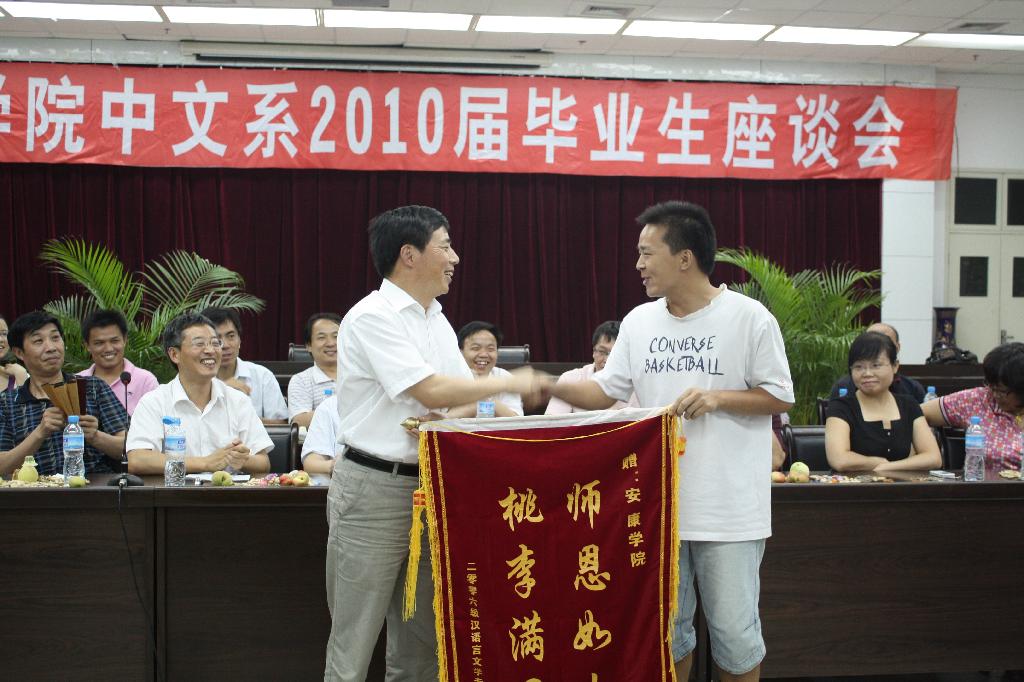 2010年6月30日,中文系在学院图书馆六楼报告厅召开2010届毕业生座谈会,学院党委副书记胡鸿晓教授、中文系主任戴承元教授、中文系党总支书记沈军老师等党政领导、孙鸿教授、周政教授等二十余名教师出席了座谈会,中文系2010届毕业生代表和大二、大三学生代表参加了座谈会。座谈会由中文系党总支书记沈军老师主持。