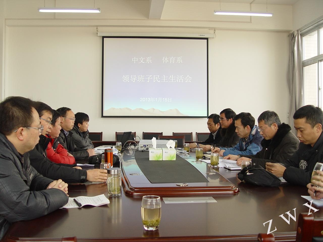 为了更好地查找工作中的不足、相互交流沟通、取长补短,更好地推动工作,中文系、体育系于2013年1月15日下午在陕南民间文化研究中心会议室联合召开了2012年度系级领导班子民主生活会。学校党委副书记、纪委书记闵小平参会并主持会议,学校监察处副处级纪检员陈爱平、两个系全体领导班子成员和教师代表参加了本次民主生活会。