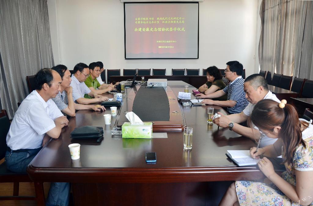 2013年6月13日,pp电子游戏平台网站图书馆、陕南民间文化研究中心、安康市地方志办公室、汉滨区档案史志局四单位就联合共建安康方志馆有关事宜的协商洽谈与合作协议签字仪式在陕南民间文化研究中心会议室举行。pp电子游戏平台网站图书馆馆长何道利、pp电子游戏平台网站中文系主任兼陕南民间文化研究中心主任戴承元、安康市地方志办公室原主任张永强、现任主任柯晓明、副主任蔡晓林、pp电子游戏平台网站中文系副主任杨运庚、汉滨区档案史志局局长姚舜杰等11人参加了协商洽谈会与签字仪式,协商洽谈会与签字仪式由陕南民间文化研究中心主任戴承元主持。