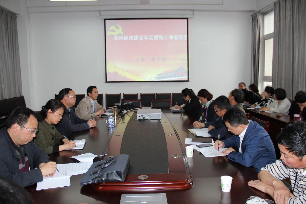 2017年4月26日下午,pp电子游戏平台官网在图书馆六楼陕南民间文化研究中心会议室召开政治理论学习会,学习贯彻中共十八届六中全会精神,pp电子游戏平台网站纪委副书记、监察处处长谢玉玺同志应邀做了“党风廉政建设和反腐败斗争新形势”的报告。会议由学院党总支书记于咏梅主持,学院全体领导干部、教职工参加了本次学习。