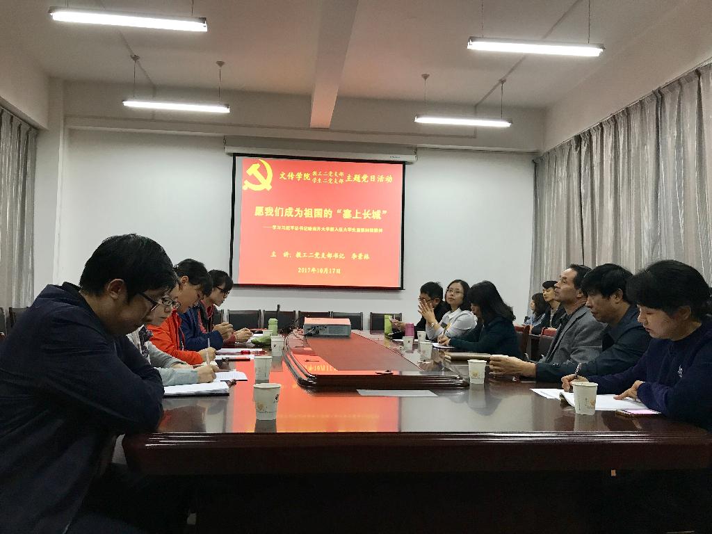 2017年10月17日,在中国共产党第十九次全国代表大会召开前夕,pp电子游戏平台网站教工二党支部、学生二党支部党员同志与部分有志于参军入伍的青年学生齐聚一堂,开展题为“愿我们成为祖国的‘塞上长城’”的主题党日活动,重点学习贯彻习近平总书记给南开大学新入伍大学生重要回信精神。学校党委书记王国良以普通党员身份参加了本次主题党日活动,教工二党支部组织委员侯红艳主持会议。