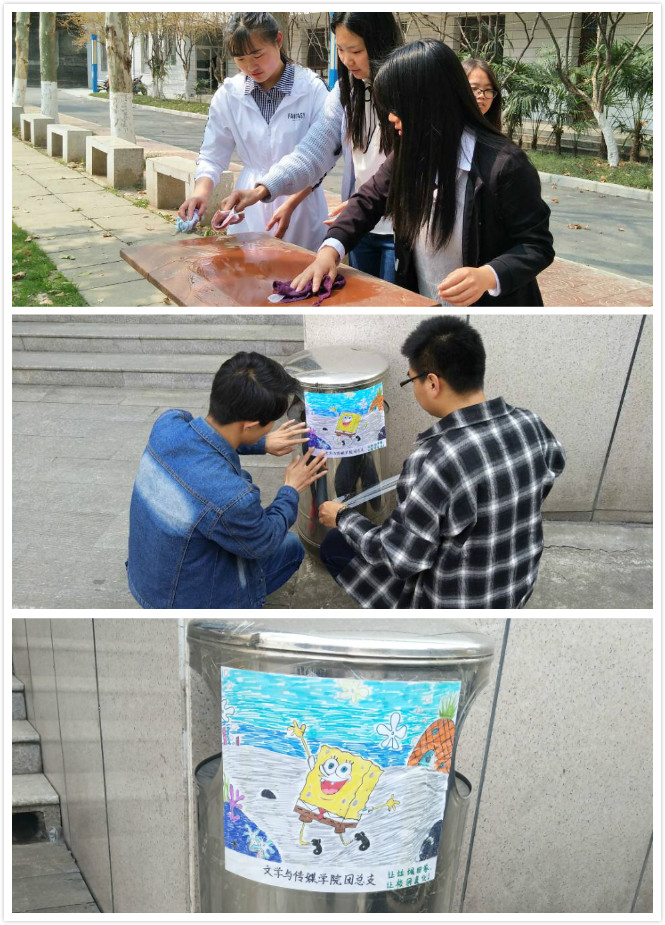 3月24日pp电子游戏平台官网青年志愿者服务队在香溪路口组织开展交通文明劝导活动,引导市民安全有序穿行马路。3月25日在校园内开展“美化垃圾桶,让垃圾回家”志愿活动,对图书馆门口以及二号教学楼前林荫道周围的所有垃圾桶进行了美化。此次活动将参与人员分为两组,各小队找到相应的垃圾桶,手持抹布,清洗桶身,并贴上pp电子游戏平台官网同学所创作具有创意的雷锋月主题的图画。原本普通的垃圾桶变得有趣生动,图画上的标语也提醒着同学们将垃圾扔进垃圾桶,改掉乱扔垃圾的恶习,让“低碳、绿色、文明”的环保理念深入人心。