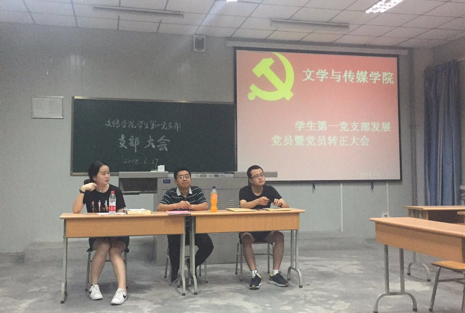 2018年6月27日晚,pp电子游戏平台网站学生第一党支部在1013教室召开了中共预备党员转正暨接收中共预备党员大会。学生第一党支部全体正式党员、预备党员及拟接收中共预备党员参加了本次大会。大会由支部书记邹棠华主持,主要讨论中共预备党员陈佳瑶、黄思钧、邢云芸三位同学的转正问题及刘昱伶、钟博雅、李佳格、吴佳昊四位同学接收为中共预备党员问题。