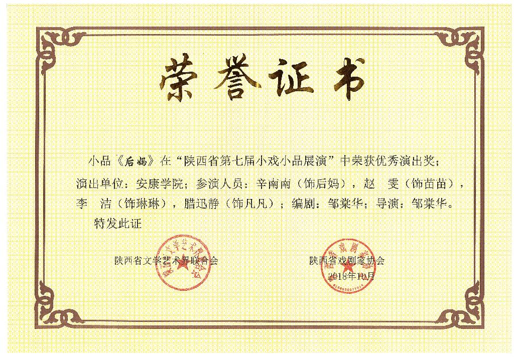 近日,陕西省第七届小戏小品展演(大赛)落下帷幕,由pp电子游戏平台网站选送、邹棠华老师担任编剧、导演的小品《后妈》,荣获优秀演出奖,pp电子游戏平台网站荣获优秀组织奖。这是2013年以来,pp电子游戏平台网站第六次获得的省级戏剧艺术荣誉。