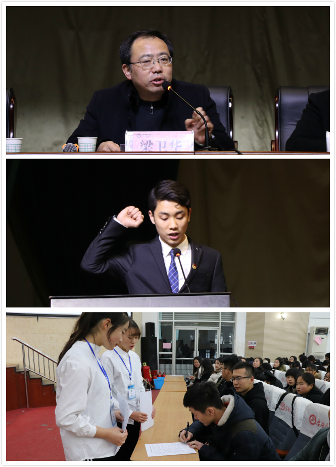 随后,梁卫华宣读了pp电子游戏平台网站关于考试的各项规章制度,以及pp电子游戏平台网站学生参加各类考试的“六个严禁”。他希望全体学生都能够端正考风,严肃考纪,营造文明、诚信考试的良好氛围,建立一个公平、公正、诚信、和谐的学习和考试环境,不要给自己的青春留下污点和遗憾。接着,由学生代表彭俊代表全体学生作考前宣誓,以表示诚信考试的决心,并由工作人员将诚信考试承诺书发予各学生代表进行现场签字。