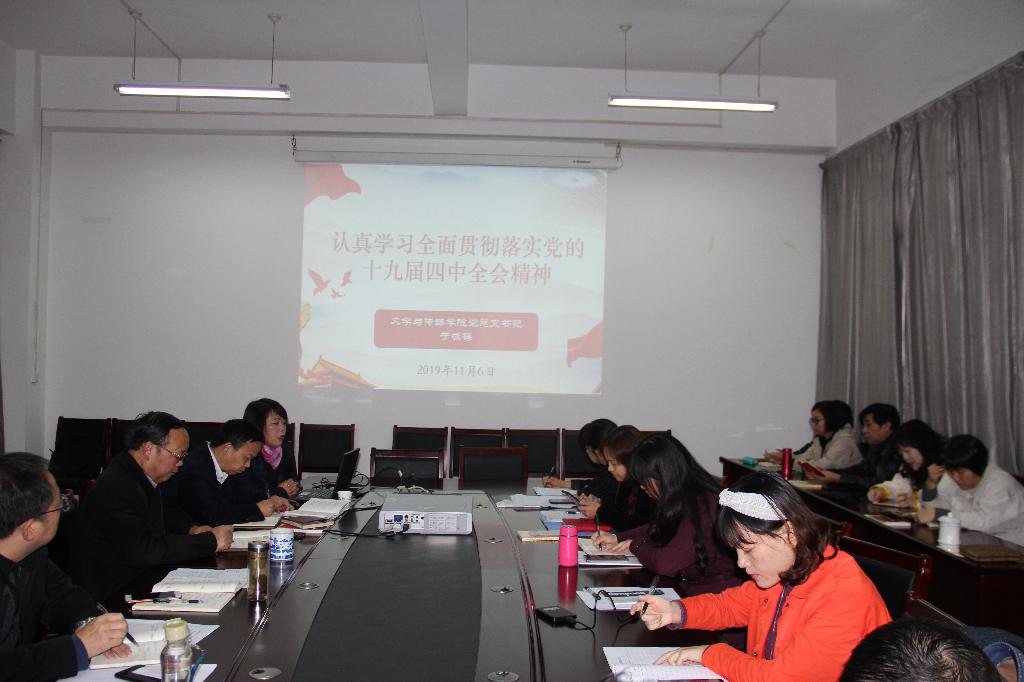 11月6日下午,pp电子游戏平台网站党总支召开学习传达党的十九届四中全会精神专题会议,全体教师参加会议。