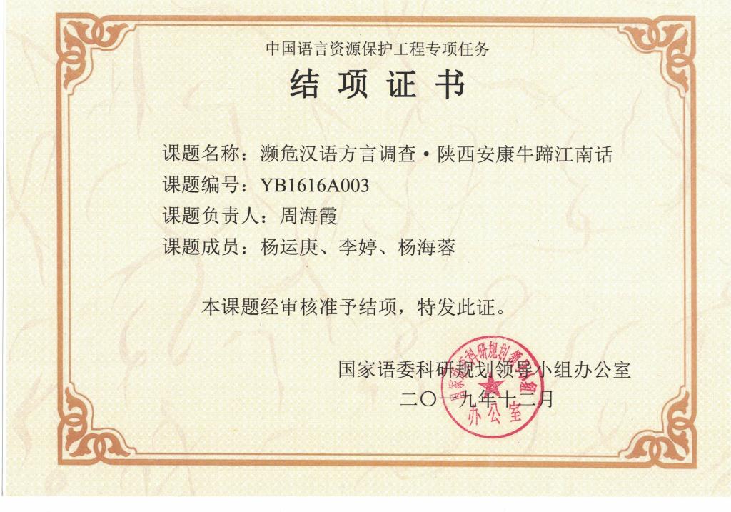 导航痕迹 首页 > 新闻通知 > 学院新闻 > 正文 学院新闻 通知公告 pp电子游戏平台网站教师周海霞主持的中国语言资源保护工程重点专项项目顺利结题 发布人: 发布日期:2020年10月28日 阅读次数: pp电子游戏平台官网教师周海霞主持的中国语言资源保护工程重点专项项目“濒危汉语方言调查·陕西安康牛蹄江南话”顺利通过结题验收,音频、视频、文字资料全部合格并收入中国语言资源库。 “濒危汉语方言调查·陕西安康牛蹄江南话”项目2016年4月正式被国家语委科研规划领导小组办公室立项,到账经费18万元,牛蹄江南话也是本批中国语言资源保护工程项目确定列入的陕南范围内的唯一一个濒危汉语方言保护调查点。本项目研究历时三年六个月,项目成果录制音频、视频资料各3828条,收集方言民俗照片100余幅,形成方言志书文字材料30余万字。 撰稿/周海霞 审核/杨运庚 发布/崔瑜