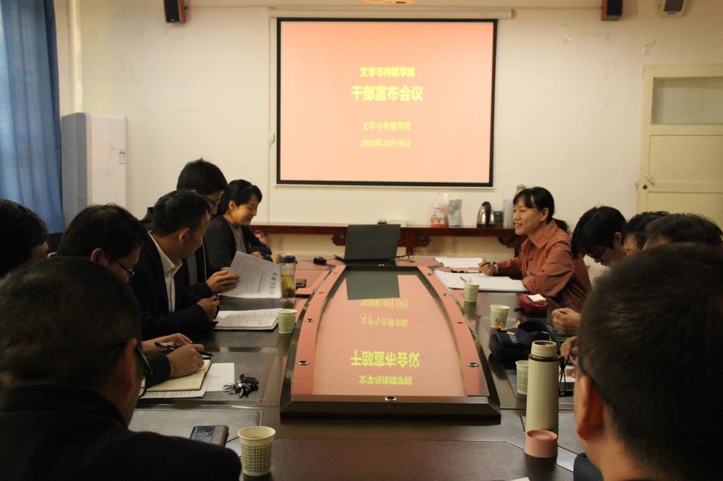 院长杨运庚在大会上宣读了校发〔2020〕144号文件《关于李莉等同志职务任免的通知》,宣布pp电子游戏平台网站教师崔瑜任院综合办公室主任,pp电子游戏平台网站教师胡少山任陕南民间文化研究中心办公室主任,薛涛任院学生工作办公室副主任。全体教师对新任命的三位老师表示祝贺。