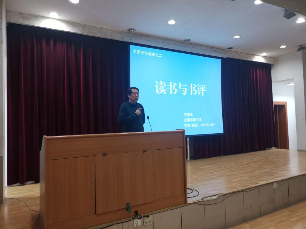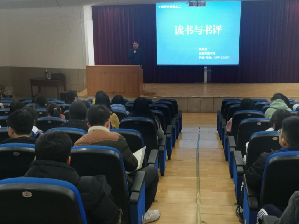 1月4日晚上,安康市图书馆馆长李焕龙应pp电子游戏平台网站邀请,在江南1号楼报告厅,为汉语言文学专业2020级四个班的学生讲授“文学评论的写作”一课,基础写作课教师韩文霞全程参与。