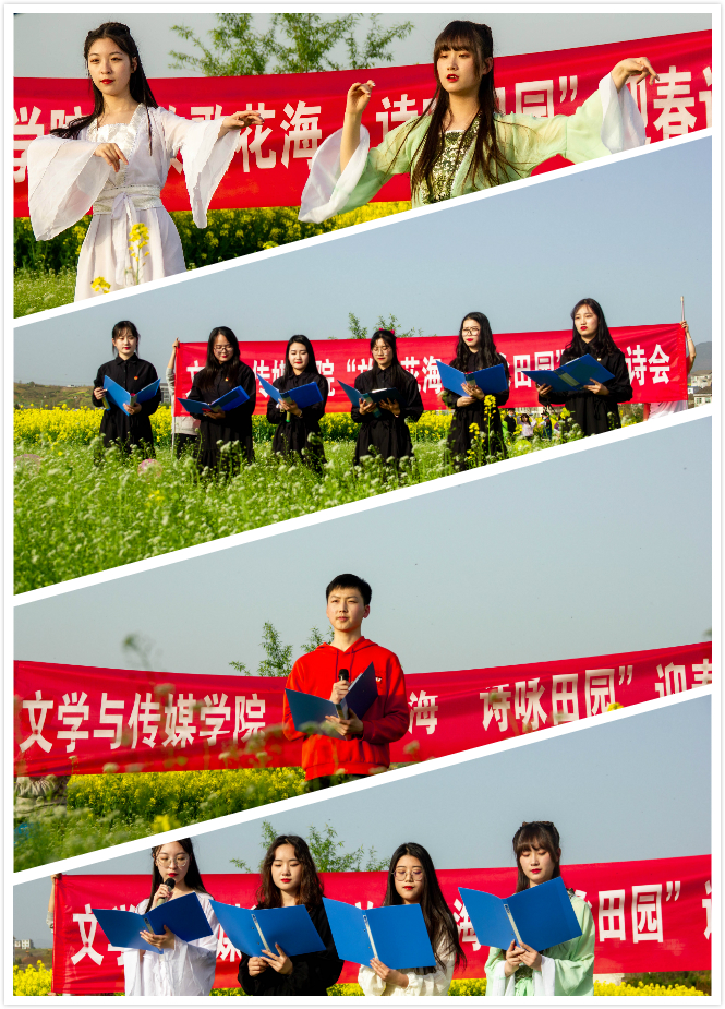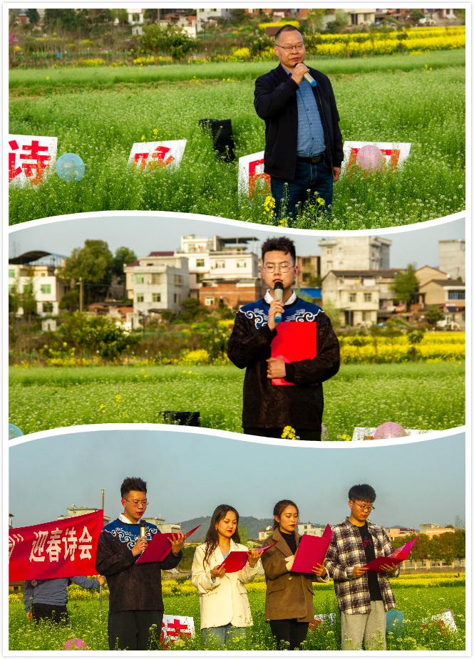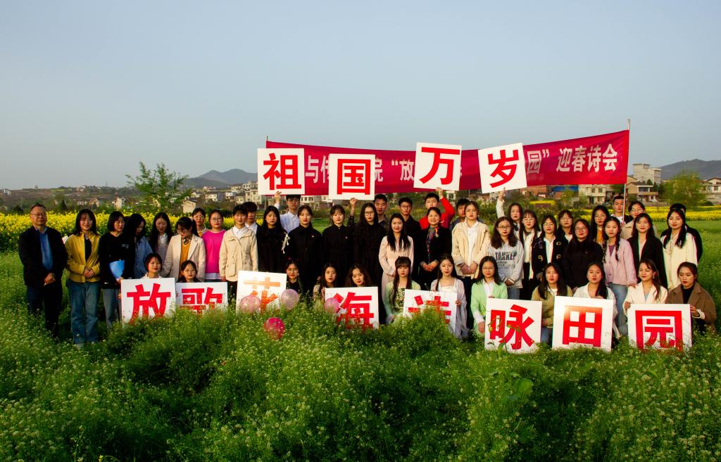 3月22日下午,pp电子游戏平台网站组织学生在张滩镇黄洋河畔举办了“放歌花海.诗咏田园”迎春诗会。本次活动由影视戏剧社承办,全院48名学生报名参加了朗诵会。pp电子游戏平台网站党总支副书记杨海蓉、郑继猛教授、辅导员邹棠华参加诗会。
