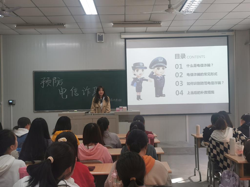 班会上,辅导员针对近期在高校校园高发的电信网络诈骗安全问题,通过具体案例,让同学们了解电信诈骗的类型、特点以及预防措施,提醒同学们要提高警惕,增强防范意识,认真学习防骗知识,同时积极向家人、朋友宣传,不给诈骗分子以可乘之机。教育引导学生理性消费,远离校园贷。此外,就学生外出交通安全、饮食安全、消防安全等问题进行了强化教育。
