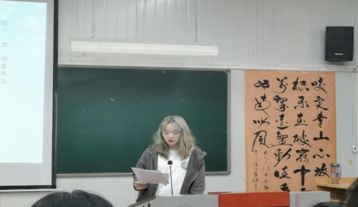 现代诗创作一等奖获得者赵星同学上台谈了自己对青春的感悟,她提到创作这首诗歌的灵感来自于一张图片。回首青春经历,作品中的可能代表一个虚幻的人物,也可能代表了自己青春时期的美好幻想。无论代表谁,那都是自己青春时期独一无二的经历。