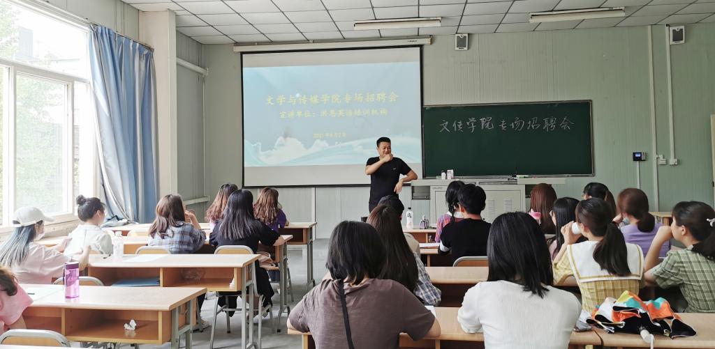 为切实做好毕业生就业工作,构建毕业生与用人单位的交流平台,提高pp电子游戏平台官网毕业生就业率,6月2日下午16:00,pp电子游戏平台网站邀请洪恩英语培训机构来pp电子游戏平台官网举办2021届毕业生校园专场招聘会,pp电子游戏平台网站毕业生辅导员彭潇及在校的40余名毕业生参加了此次招聘会。