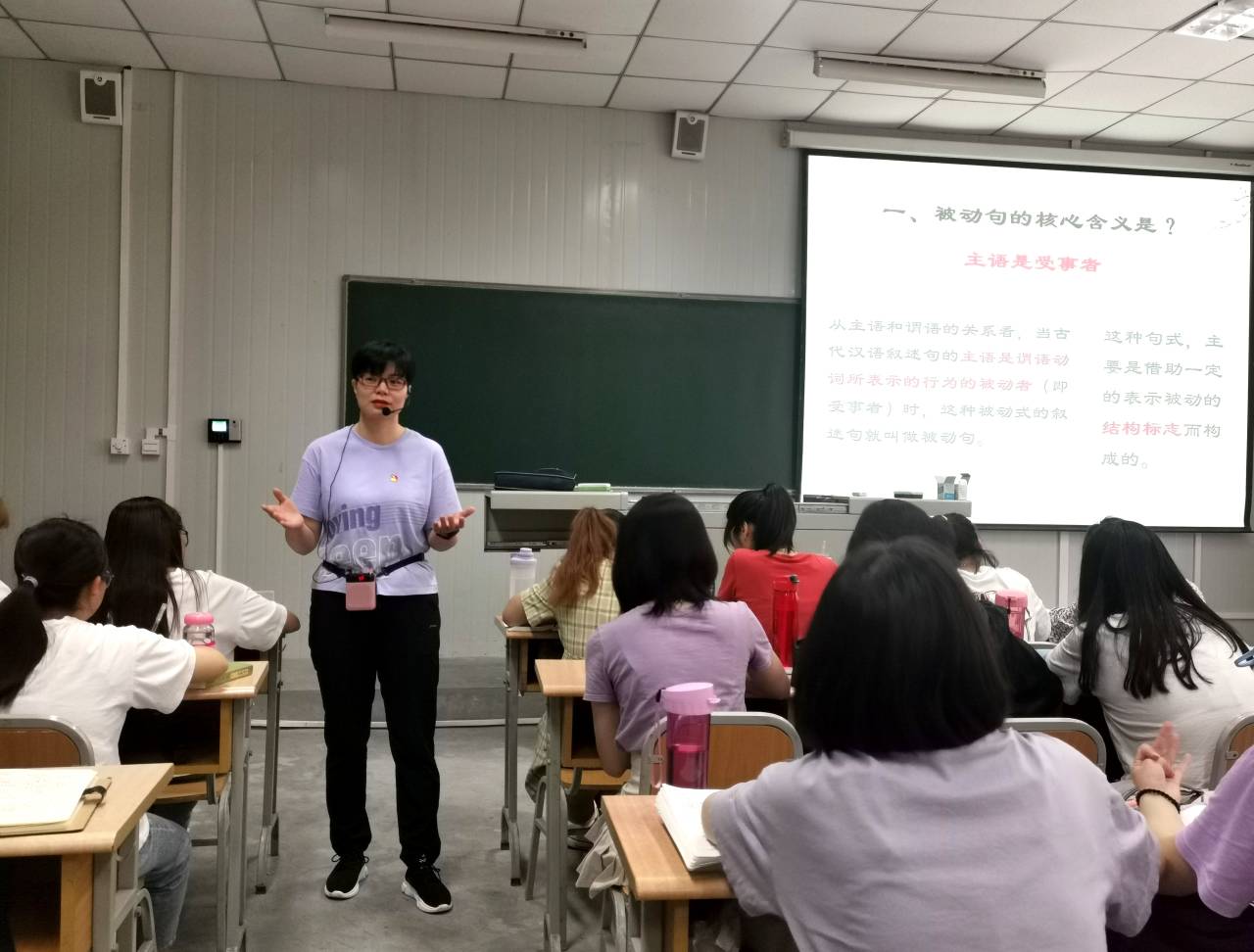 活动第一环节8:00—8:50)为观摩周海霞主讲的古代汉语课。周老师结合课前学生在线视频自学情况,以超星智慧教学app为依托,通过线上测试—现场问答—师生研讨—知识总结的方式完成了对被动句的讲授。本节课知识容量大、案例丰富、学生参与度高,课堂氛围及教学效果优良。