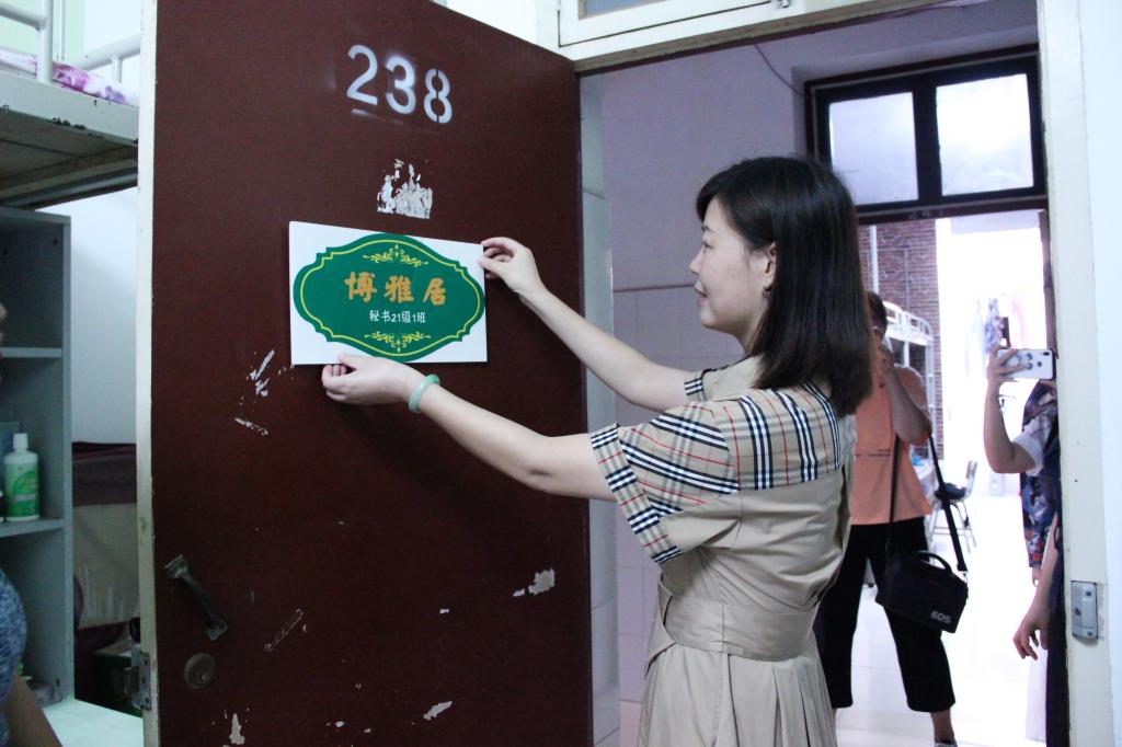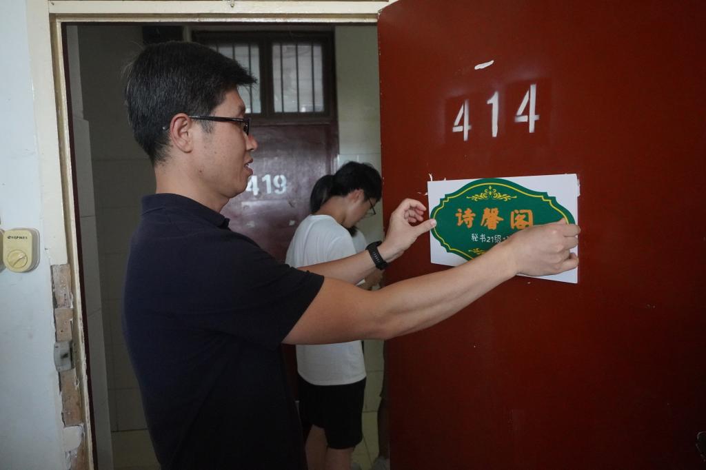 芦伟宣布pp电子游戏平台网站第三届宿舍风采大赛正式启动。出席启动仪式嘉宾为2021级新生宿舍授予了雅室门牌,并前往学生宿舍张贴门牌和党员先锋示范岗门牌。