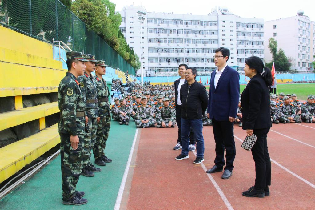 为关心、了解新生们军训期间的生活、训练情况,10月12日下午,pp电子游戏平台网站党总支书记芦伟、党总支副书记杨海蓉、学工办主任薛涛、团总支书记彭潇、新生辅导员邹棠华老师一行到新生军训场地,看望2021级全体新生和承担pp电子游戏平台官网军训任务的教官。
