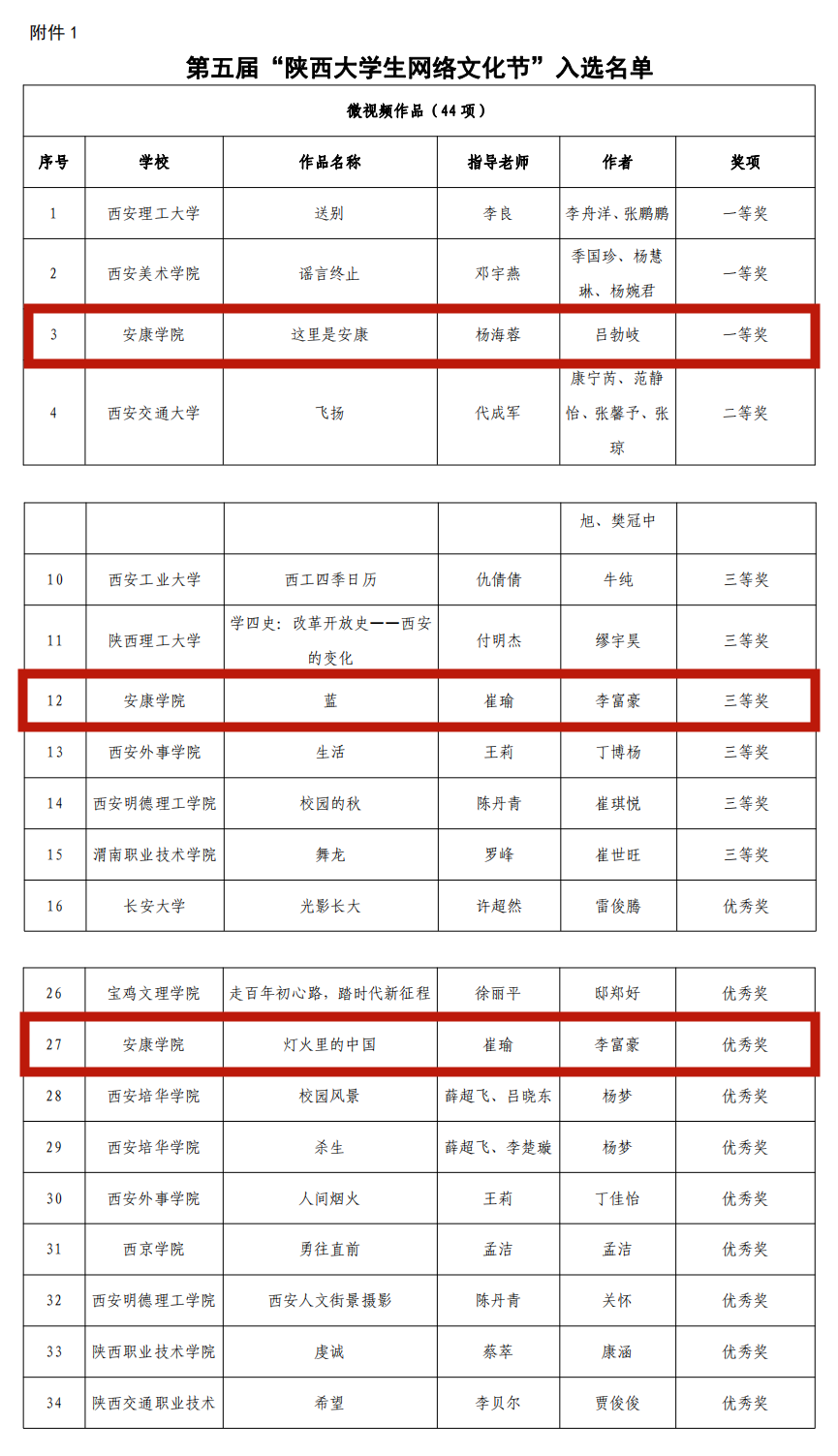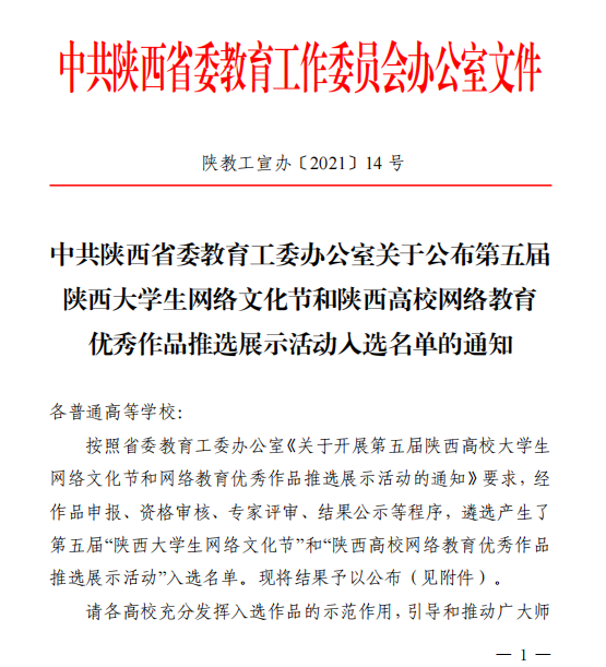 日前,由陕西省委教育工委办公室组织的第五届“陕西大学生网络文化节”评选结果落幕,经作品申报、资格审核、专家评审、结果公示等程序,遴选产生了第五届“陕西大学生网络文化节”和“陕西高校网络教育优秀作品推选展示活动”入选名单。pp电子游戏平台网站网络与新媒体专业2017级学生吕勃岐微视频《这里是安康》荣获微视频类一等奖,李富豪摄影作品《蓝》、《灯火里的中国》分别获摄影作品类三等奖和优秀奖。