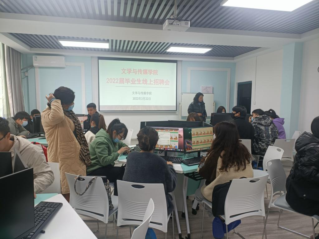 pp电子游戏平台网站按照学校就业工作安排,积极配合,组织本院2022届毕业生于2022年3月22日上午在2号教学楼2414实训室集体参加本次线上招聘。pp电子游戏平台网站党总支书记芦伟、副书记杨海蓉、毕业班辅导员艾全霞、网络与新媒体专业课教师张建涛现场指导,毕业生进入线上招聘会场,甄选专业相关岗位,积极投递简历,与用人单位沟通,互动效果良好。
