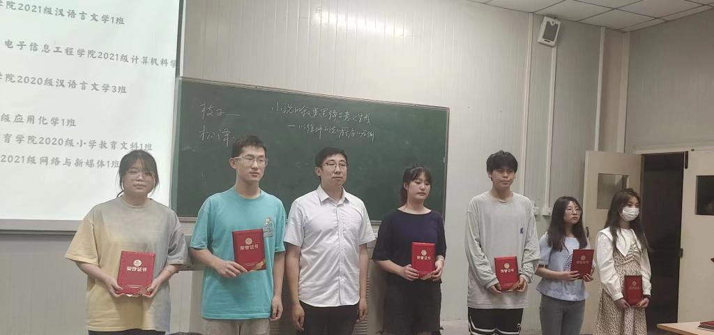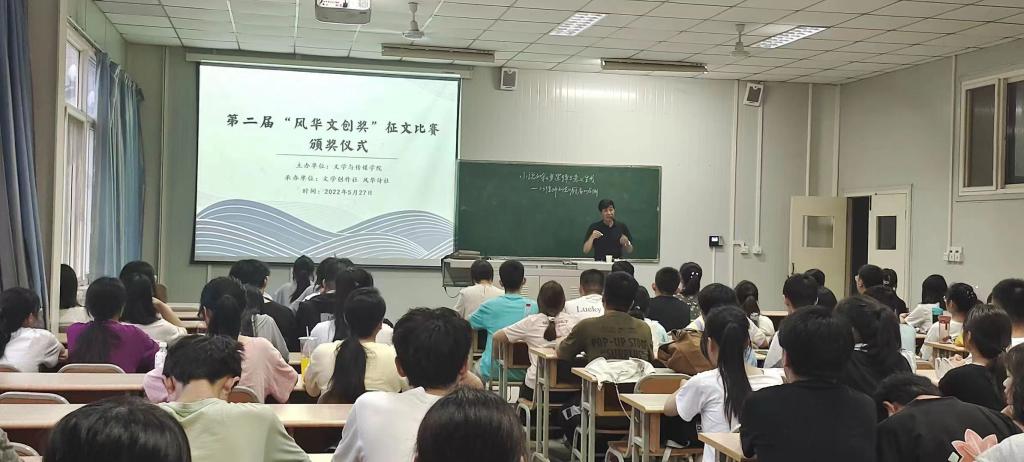 2022年5月27日晚上8点,第二届“风华文创奖”征文比赛颁奖典礼在pp电子游戏平台网站江南校区1026教室顺利举行。文学创作社指导老师李春平、风华诗社指导老师韩文霞、特邀嘉宾曹刚老师、风华诗社和文学创作社社团成员、网络与新媒体2021级同学及获奖作者代表出席本次活动。